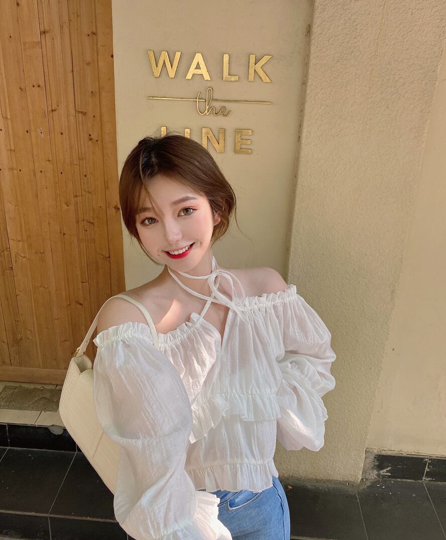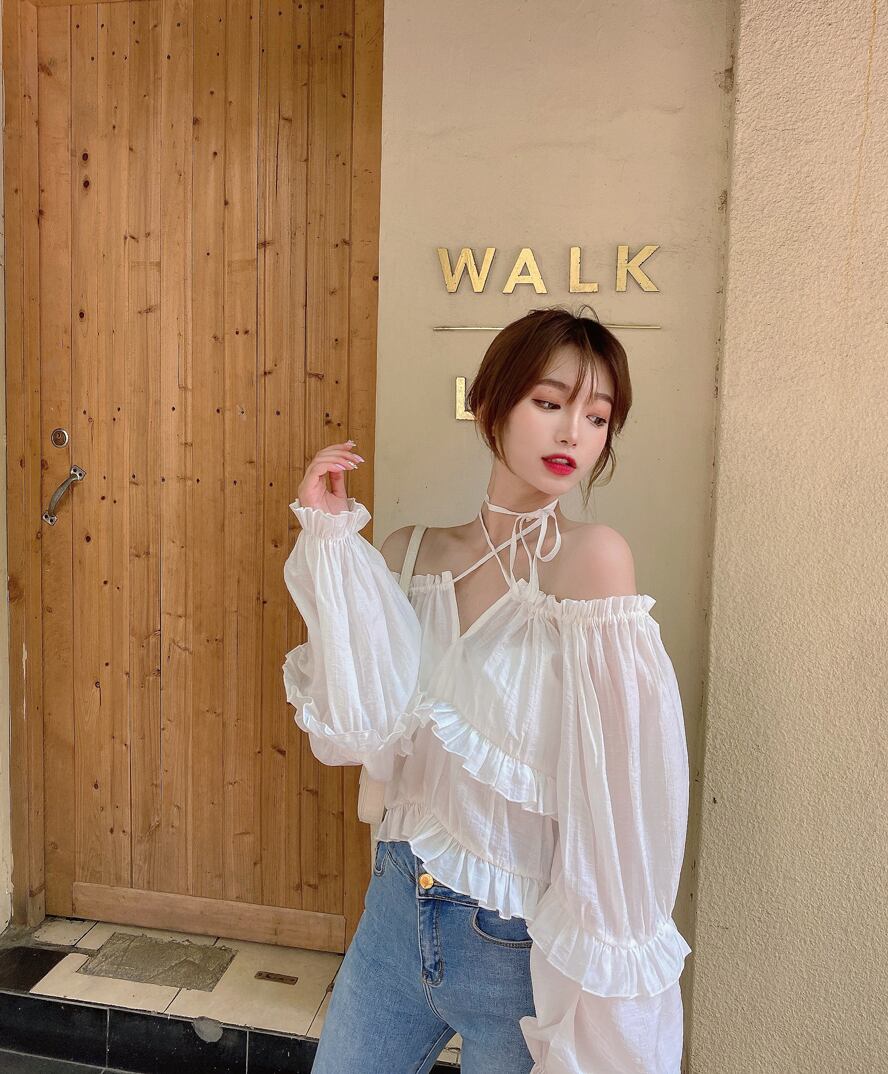 スプリングスタイルスリーブトップス ホルターショートシフォンシャツ レディース レース 春物 レースアップ ガールズファッション32183554814