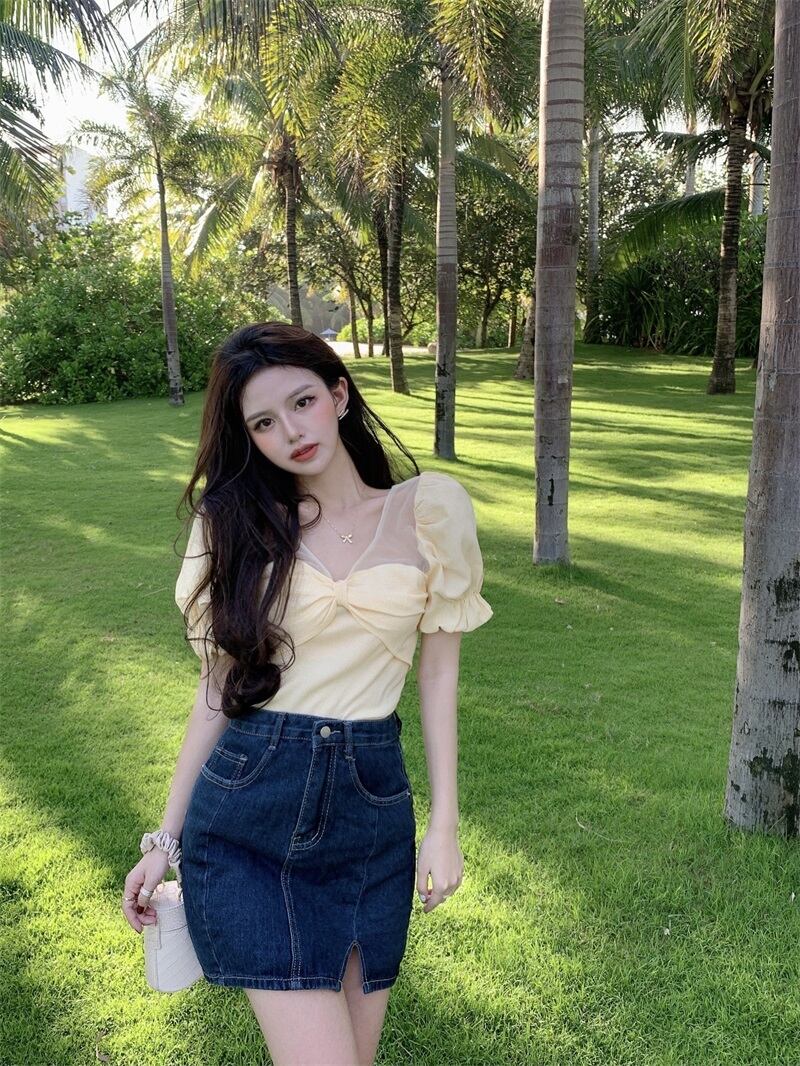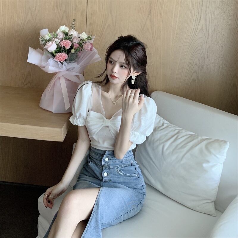 ホワイトシャツ サマースタンダード半袖スリーブトップス ショート リボン レトロ ハーフスリーブ 大人ガーリー スウィート キュート カジュアル 夏物 ガールズファッション79002370940