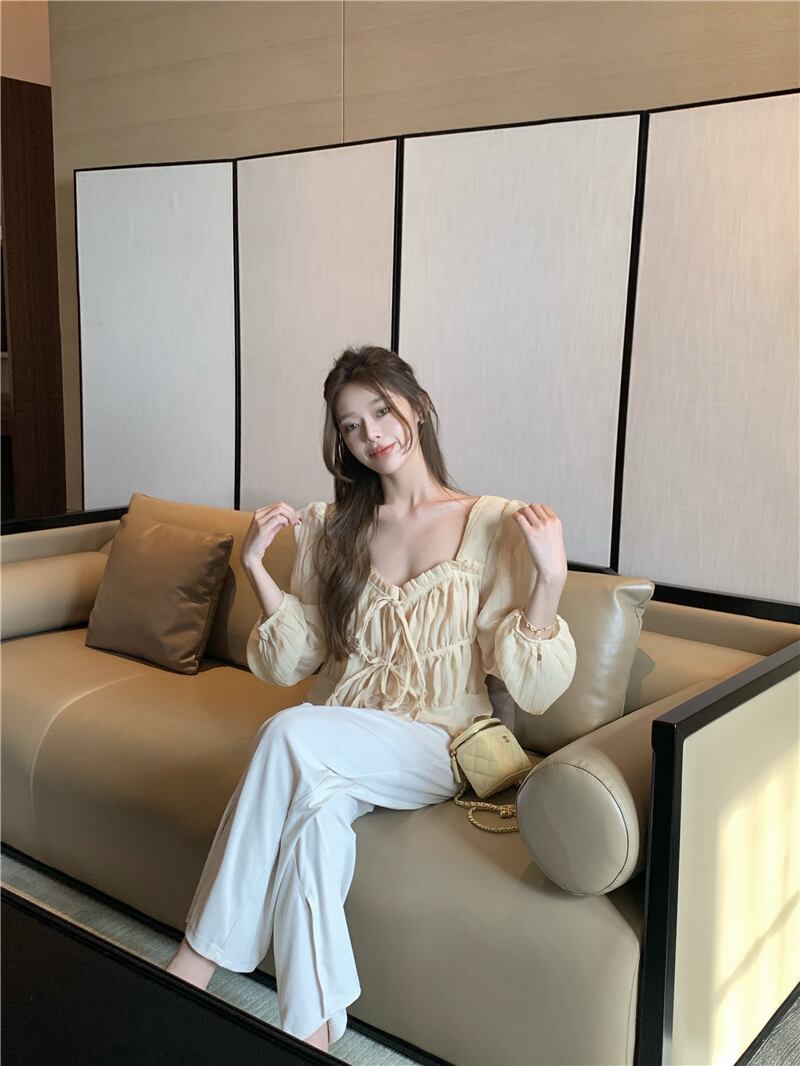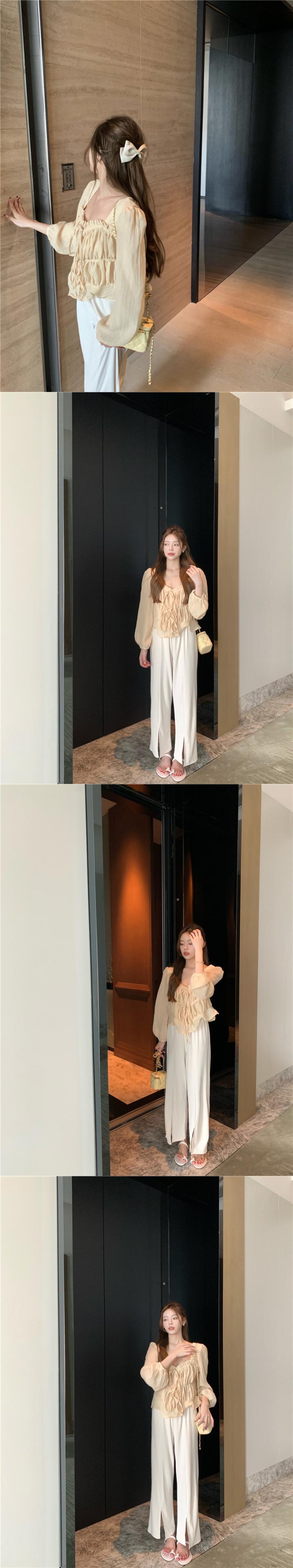 色:クリーミーな黄色のトップ,ワイドレッグパンツ