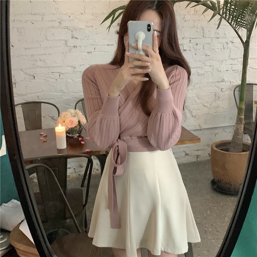 サマースタイルソリッド カラーVネックウェストニットセーター トップス ハイウェストAラインスカート 夏物 ソリッドカラー ガールズファッション38089266515