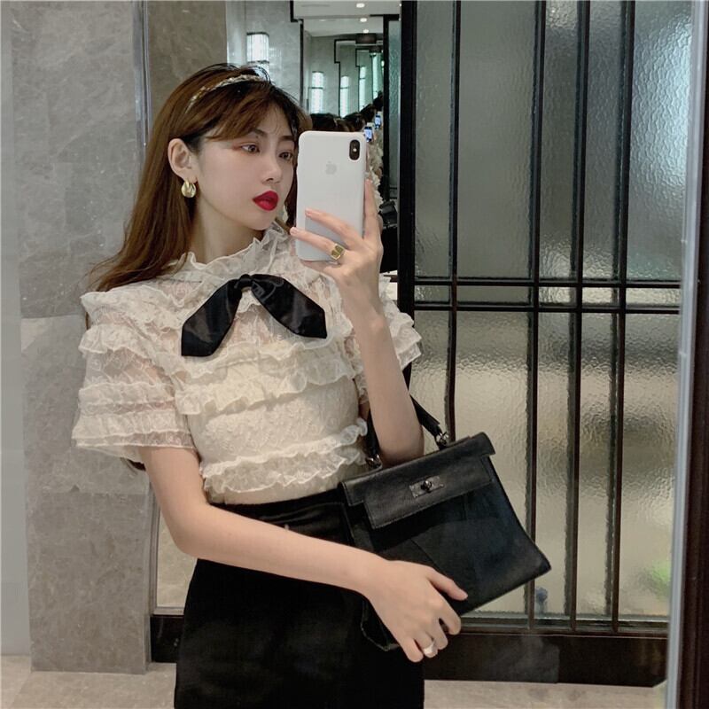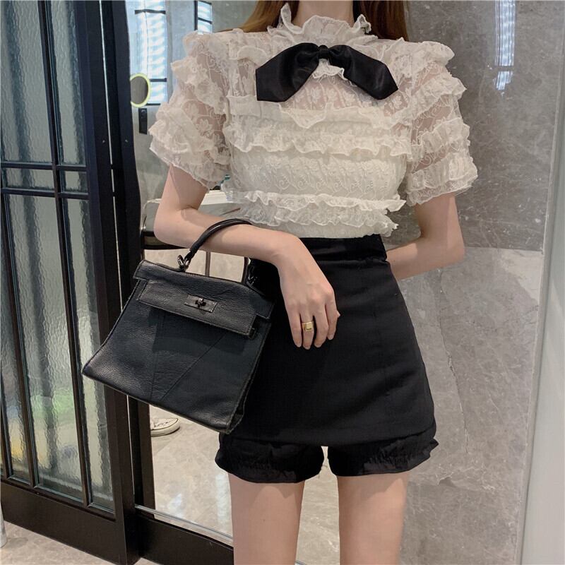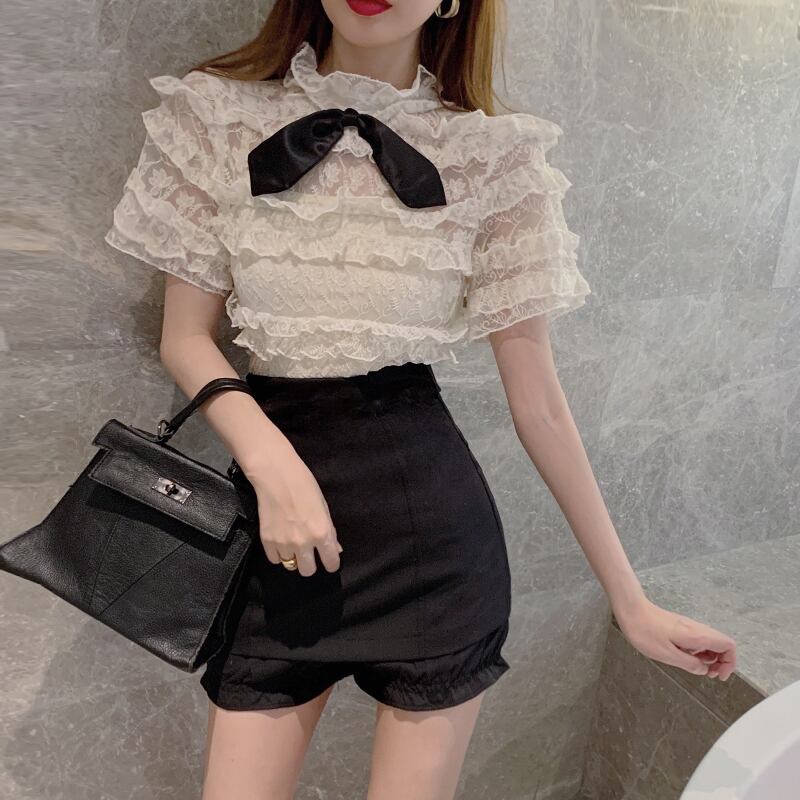 スタンダードリボンレースシャツ ハイウェストウェストFlowerデザイン ショートスカート サマー レトロ 夏物 フラワーデザイン ガールズファッション32067182109