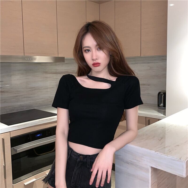 スリムブラックショートトップス サマー半袖スリーブTシャツ ハーフスリーブ 夏物 オフショルダー ガールズファッション37548700634
