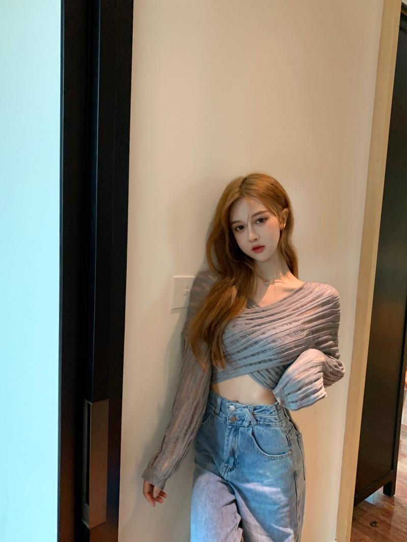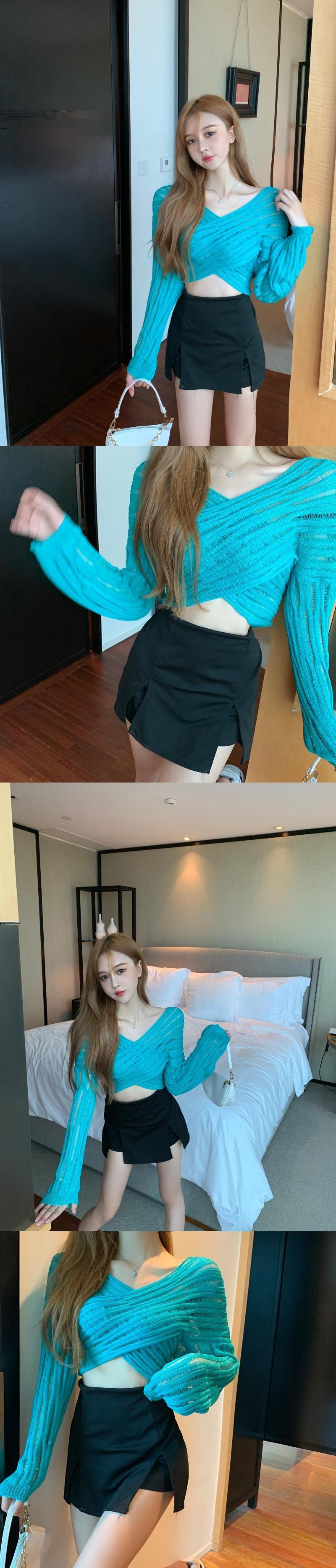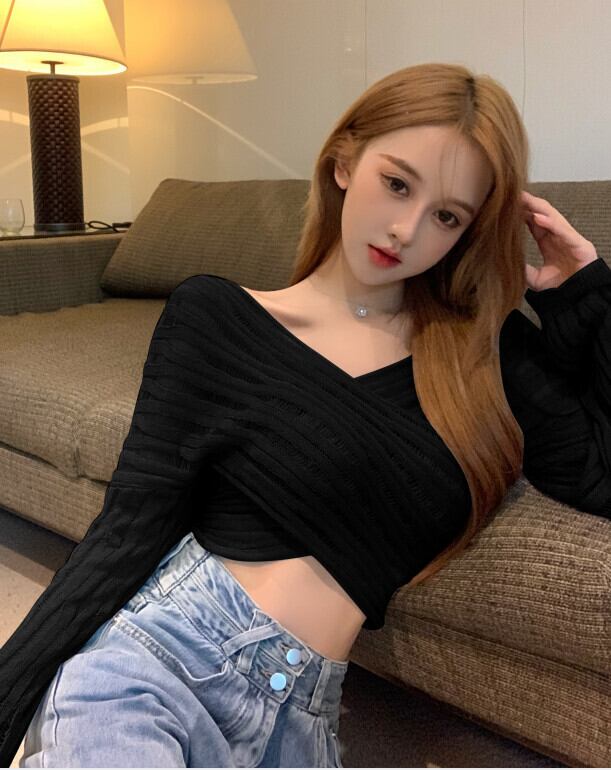 クロスセーター サマーVネッククロップドショートブラックトップス ロング 夏物 ガールズファッション69402036367