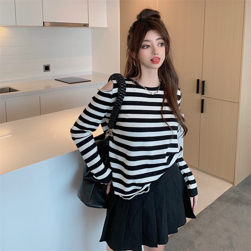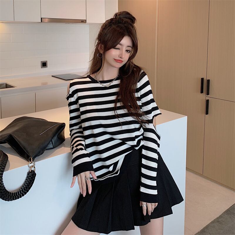 ストライプカラーラウンドネックプルオーバー ニットブラウス レディースサマールーズTシャツ トップス ロング 夏物 Oネック ガールズファッション68129591914