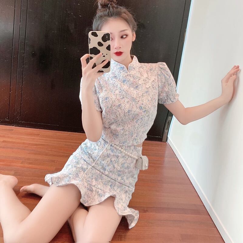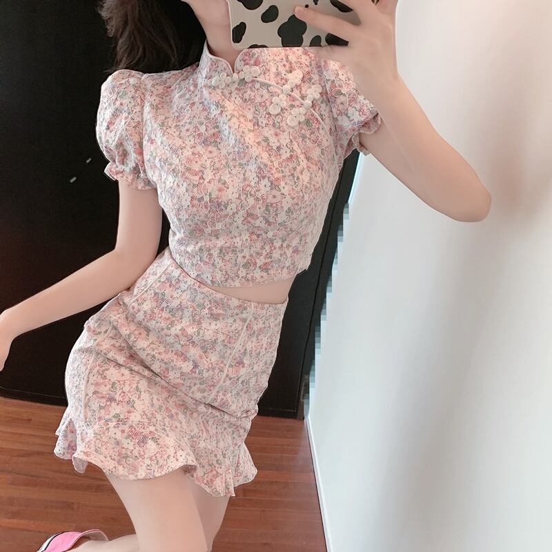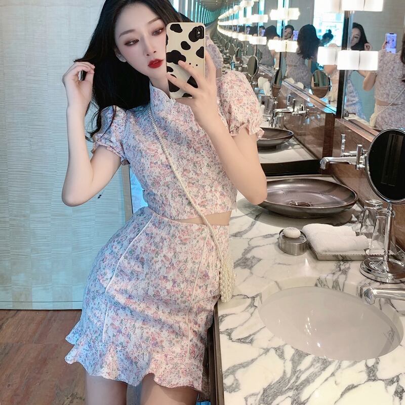 フローラルサマーレーススリーブショートトップス ハイウェストウェストスカート 夏物 花柄 ガールズファッション10181670500