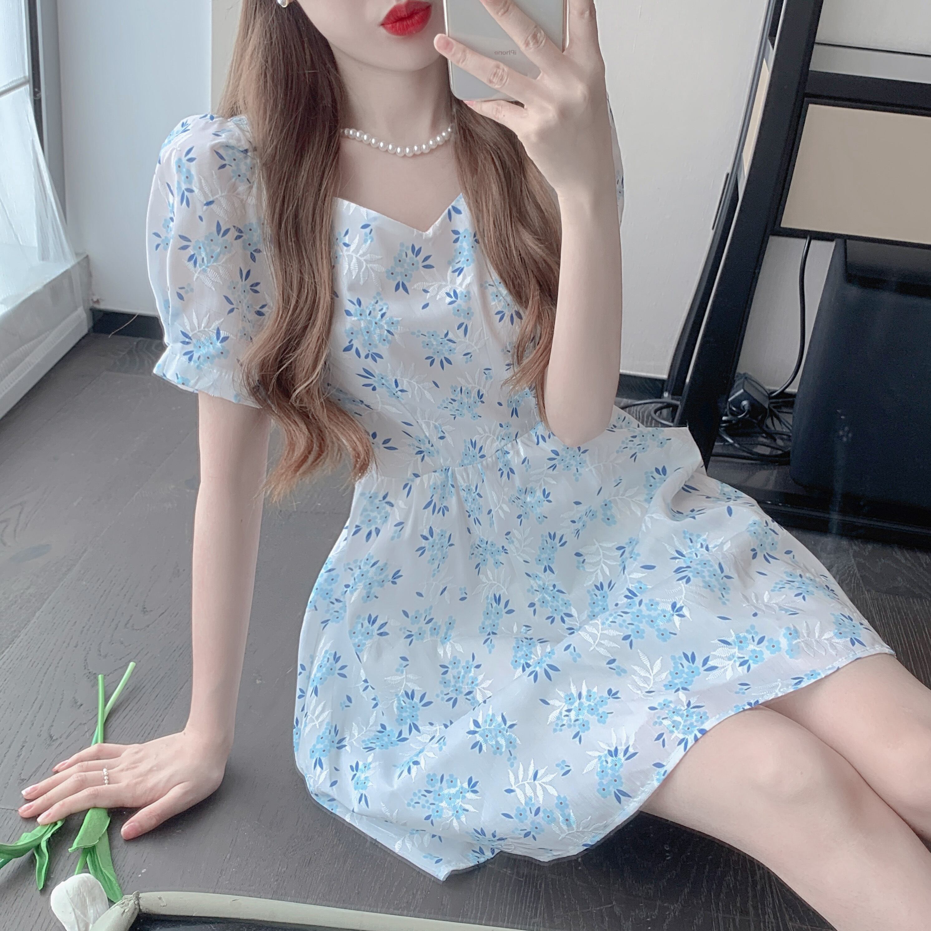 ブルーフローラルドレス バックリボンスリーブスカート 花柄 ガールズファッション70379880274