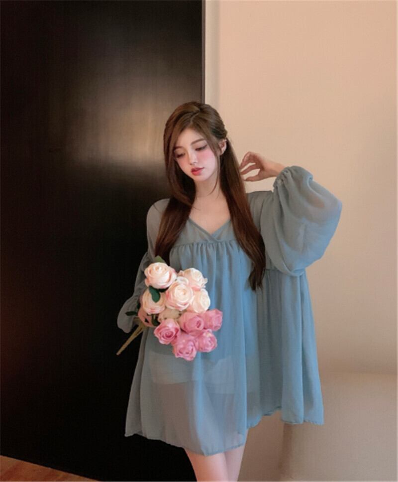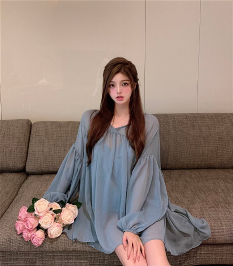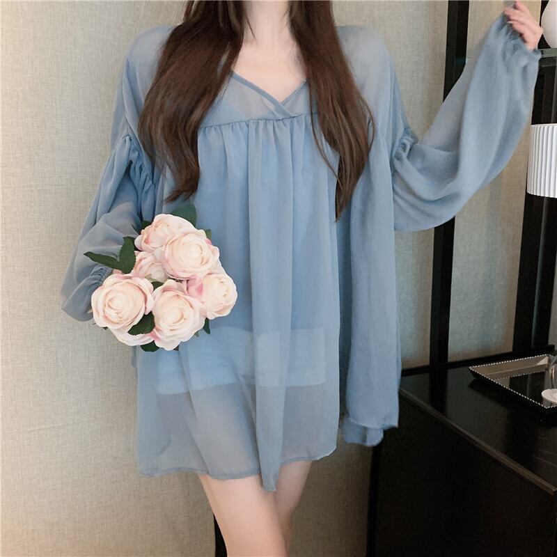 Vネックルーズ薄手ソリッド カラーシフォンブラウス サマー ロング 夏物 ソリッドカラー ガールズファッション45039331224