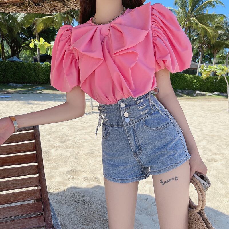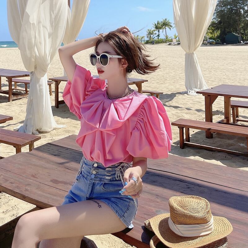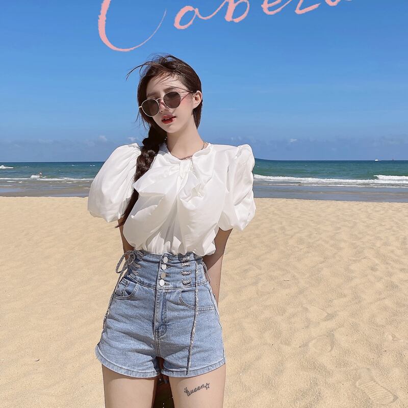 スタンダードリボンホワイトブラウス サマースリーブシフォンシャツ レトロ 夏物 ガールズファッション47086388093