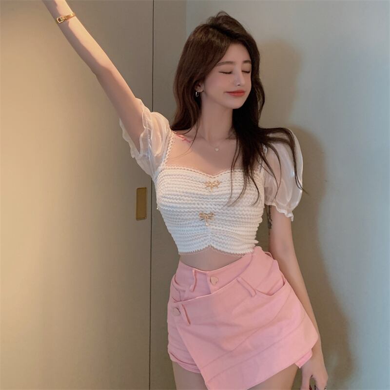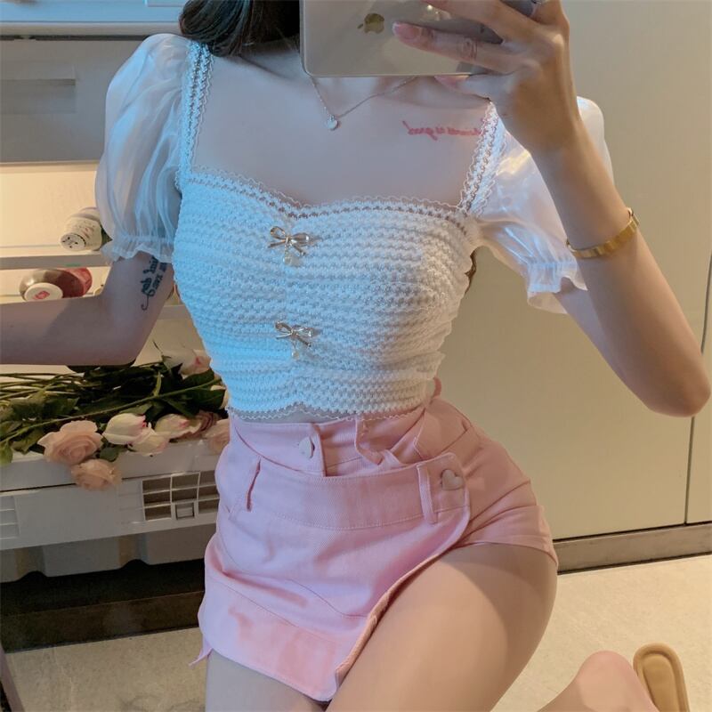 スリーブホワイトブラウス サマーショートシャツ 薄手レース 大人ガーリー スウィート キュート カジュアル 夏物 ガールズファッション85914974361