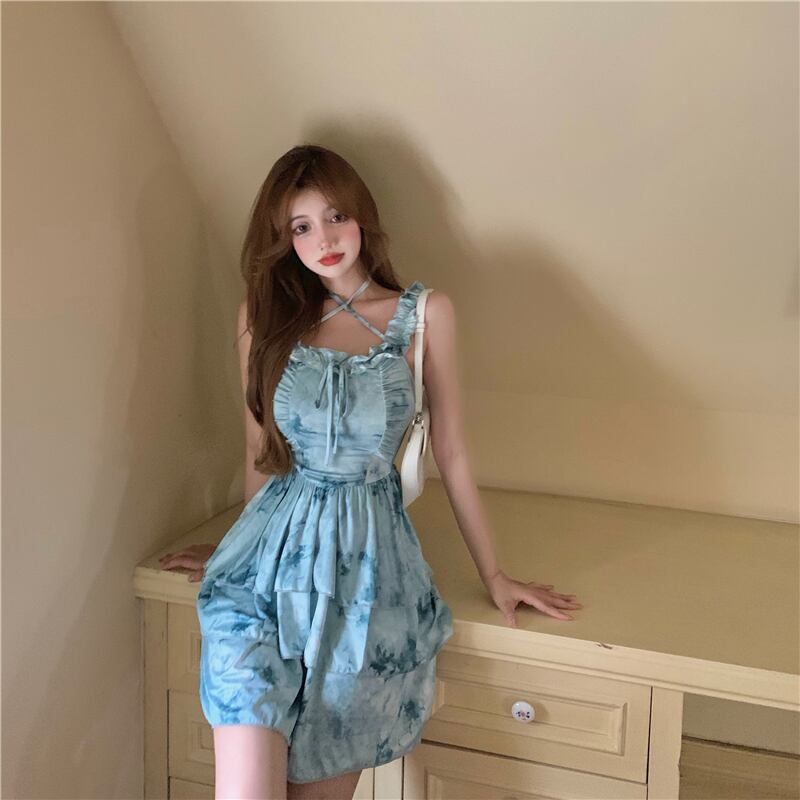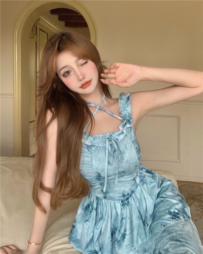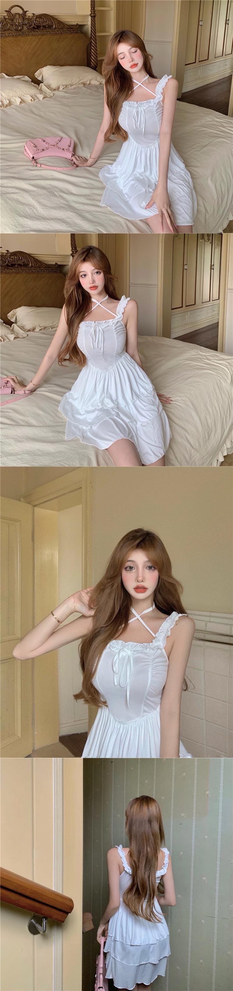 ホルターホワイトドレス サマーハイウェストウェストスカート 夏物 ガールズファッション16976177045