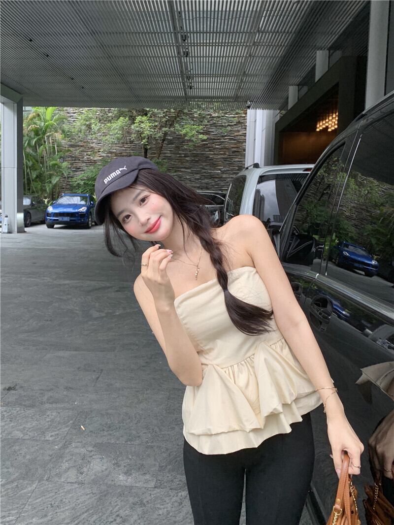 トップス サマースタンダードソリッド カラーバックレスノースリーブ レトロ 夏物 ソリッドカラー ガールズファッション18084717430