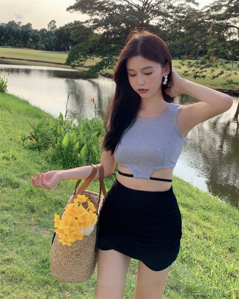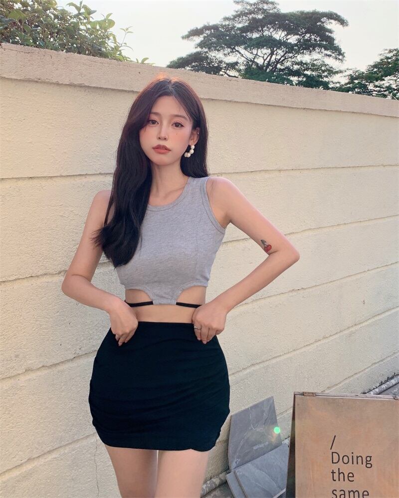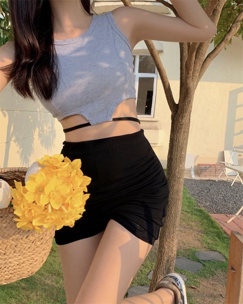 ショートウェストストラップレスサマー薄手ソリッド カラーノースリーブトップス 夏物 ソリッドカラー ガールズファッション68768624045
