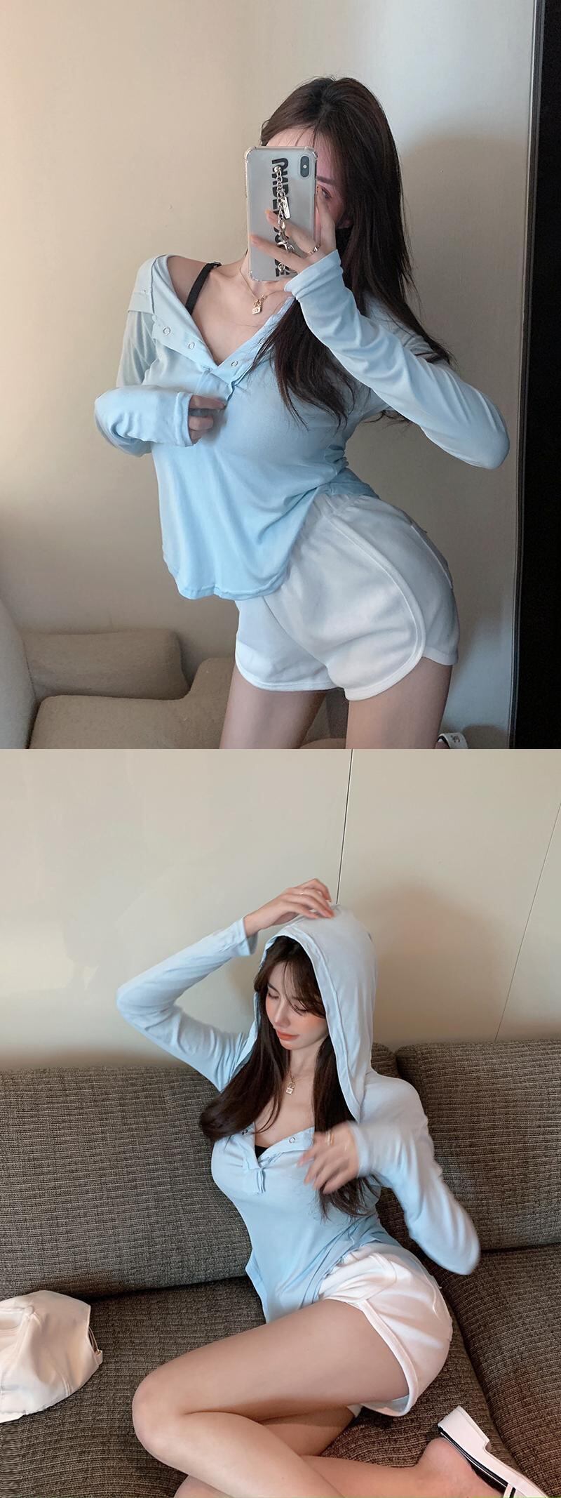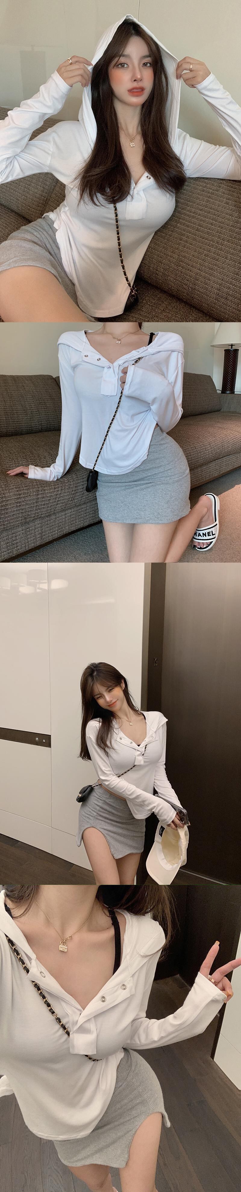フードソリッド カラートップス サマー薄手Tシャツ ロング 夏物 ソリッドカラー ガールズファッション10152776282