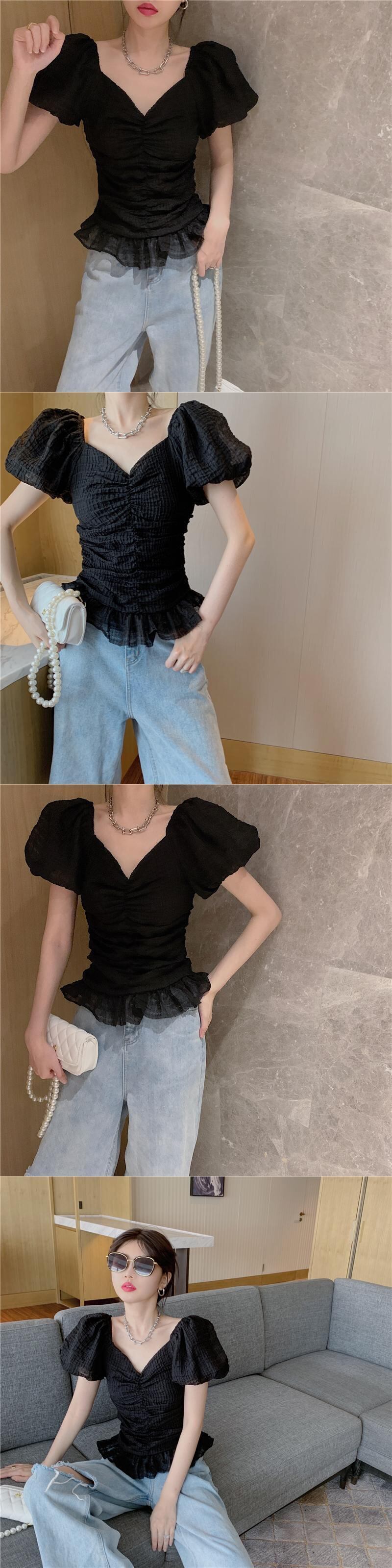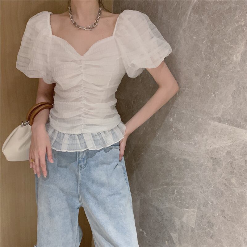 ホワイトVネックスリーブシャツ サマースタンダードスリムトップス レトロ 夏物 ガールズファッション18040021134