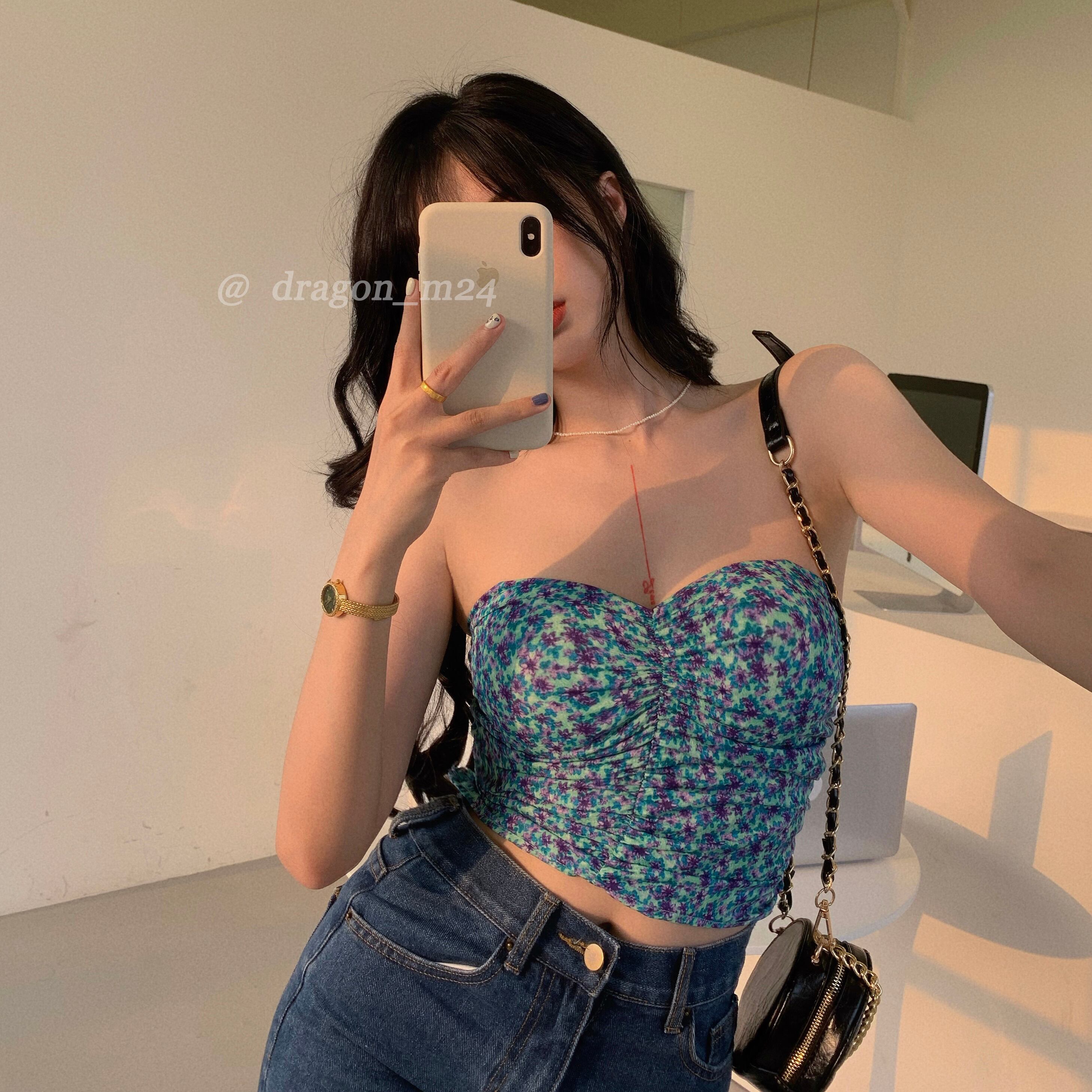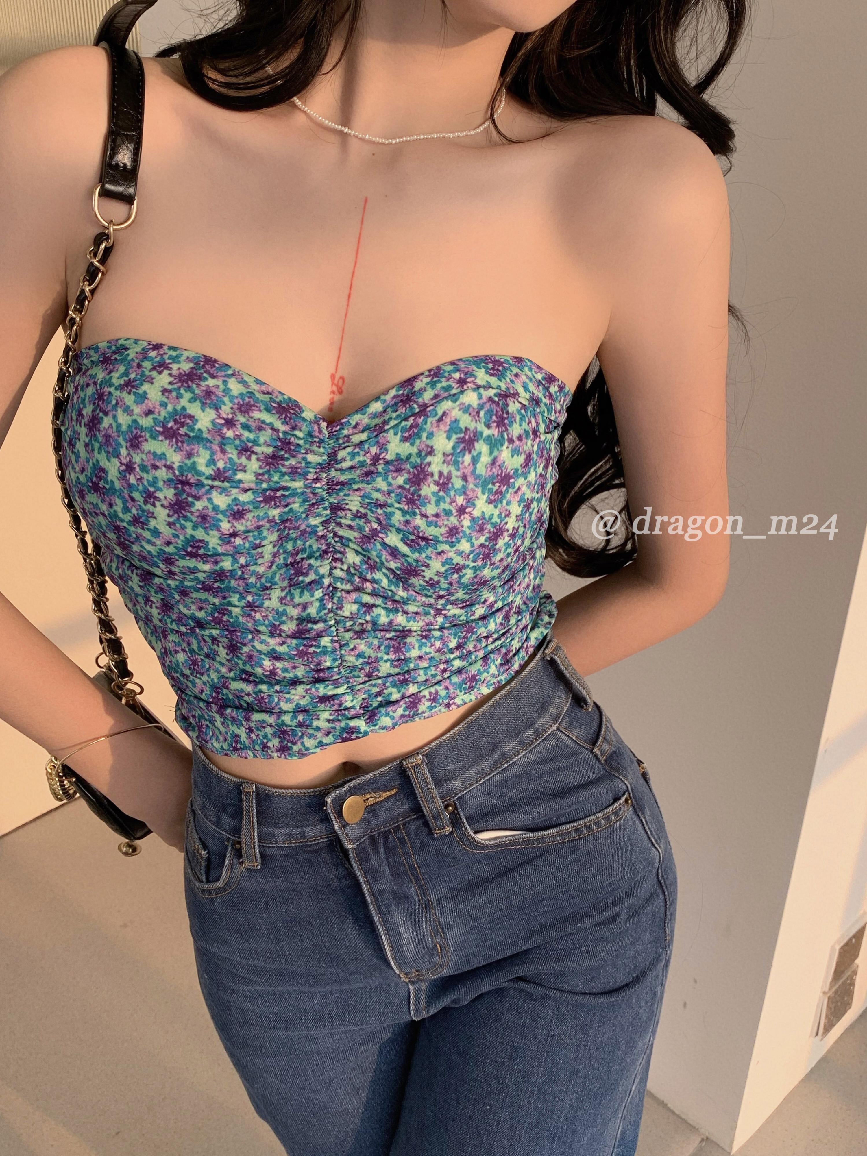 トップス ストラップレスストレッチプリーツフローラルショートサマー ブラウス ストリート エラスティック 伸縮 夏物 花柄 ガールズファッション4957111238