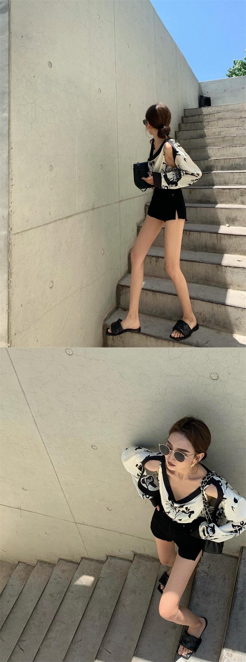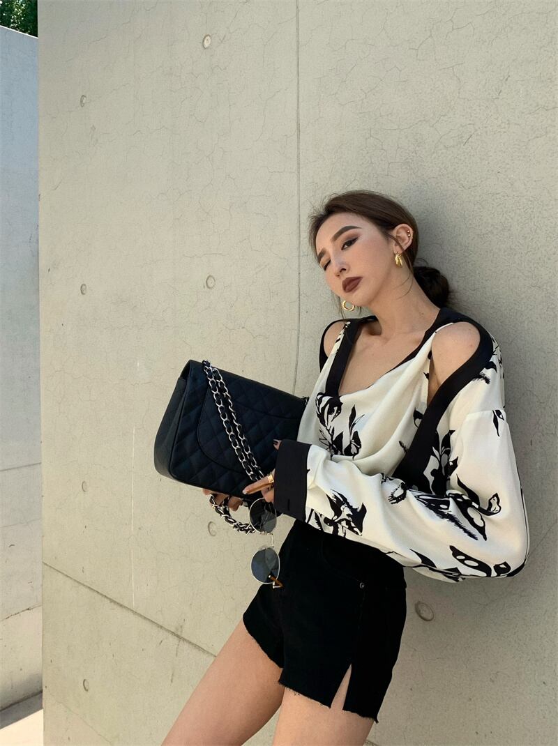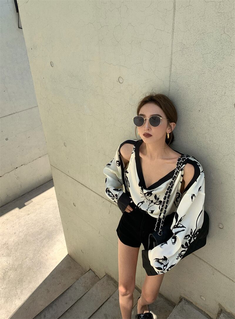 スタンダードVネックサマーシャツ カジュアルシフォントップス レディース ロング レトロ 夏物 ガールズファッション16843428413