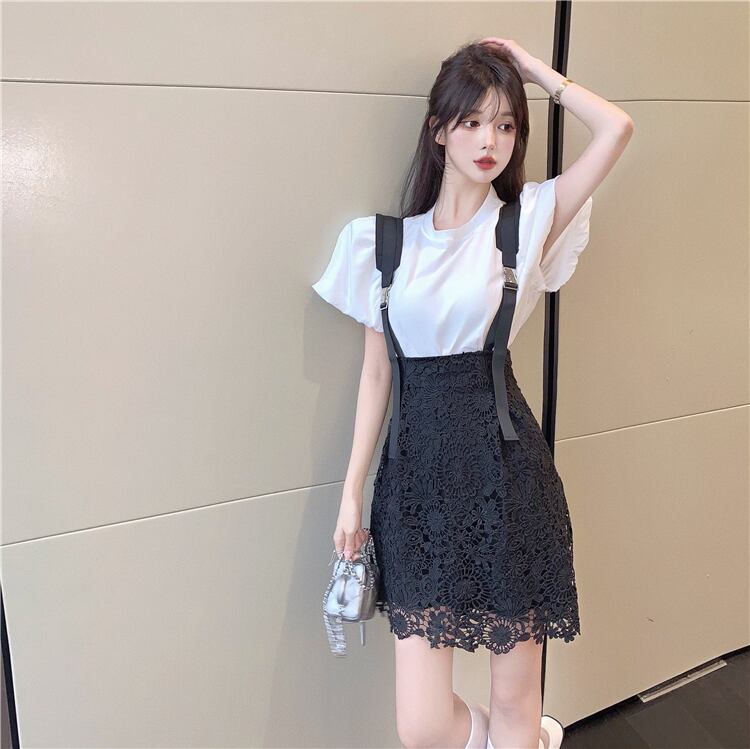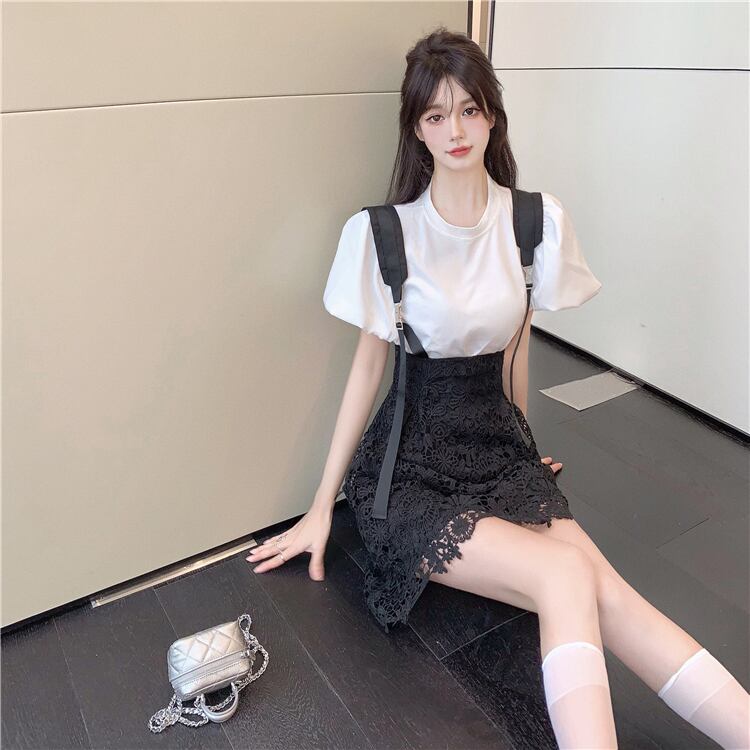 スリーブホワイトブラウス ハイウェストウェストレーススカート サマードレス ストリート 大人ガーリー スウィート キュート カジュアル 夏物 ガールズファッション64148305403
