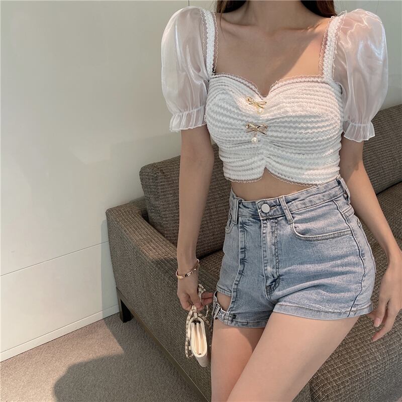 スリーブレースショートシフォンシャツ ホワイトトップス ガールズファッション93397329372