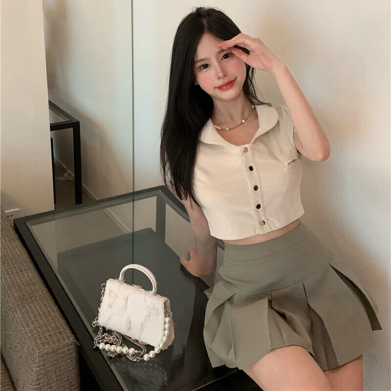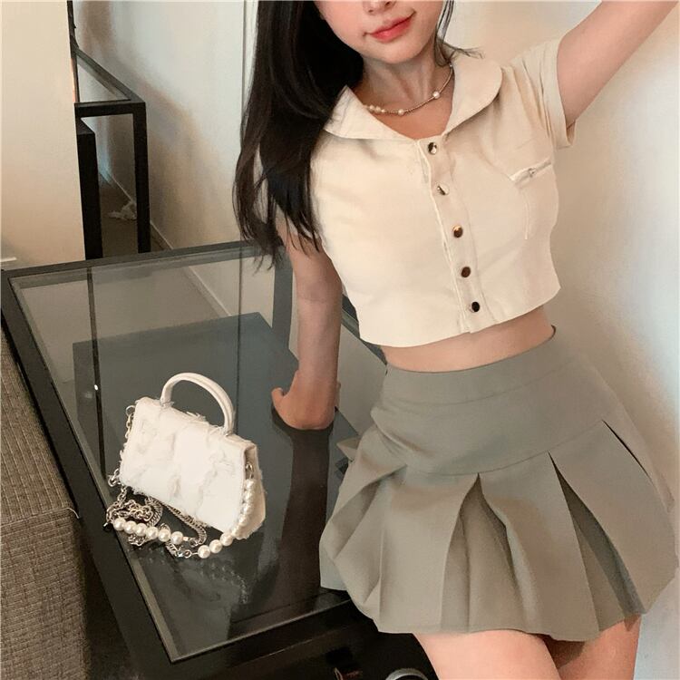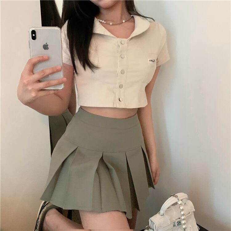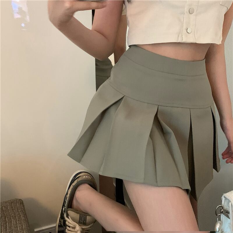 カラーブラウス ハイウェストプリーツスカート ストリート ガールズファッション7378333169