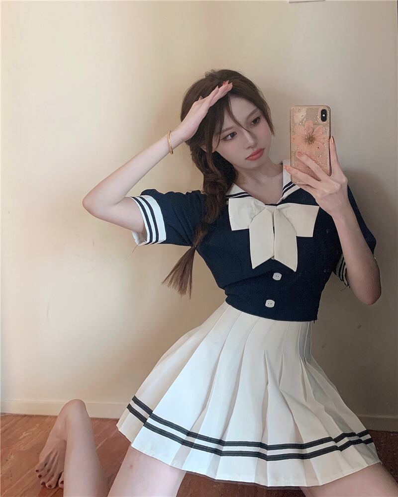 リボントップス レディースサマースタンダードネイビーカラースリムTシャツ レトロ 夏物 ガールズファッション360262946