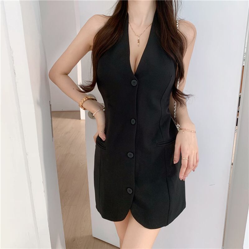スタイルブラックバックレスカラーホルタードレス サマーウェストノースリーブスカート 夏物 ピュア ガールズファッション15035246079