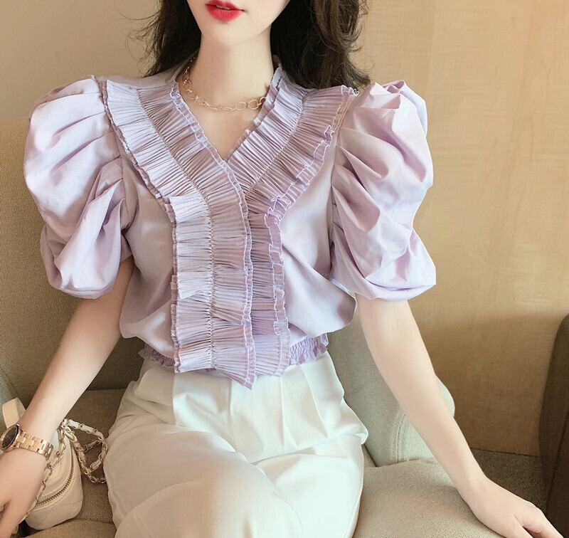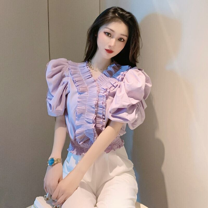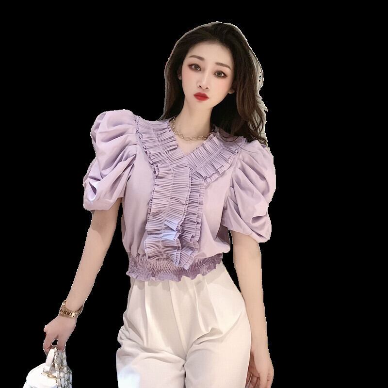 スタンダードVネックシフォンシャツ サマーウェストショートトップス レトロ 大人ガーリー スウィート キュート カジュアル 夏物 ガールズファッション14983380090