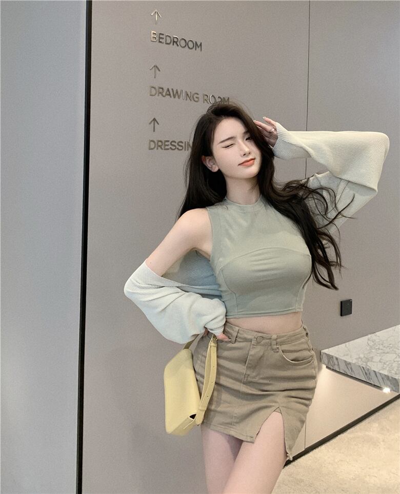 スリムショートノースリーブニットカーディガンサマー ロング 半袖 ハーフスリーブ ストリート 夏物 ガールズファッション80674300415