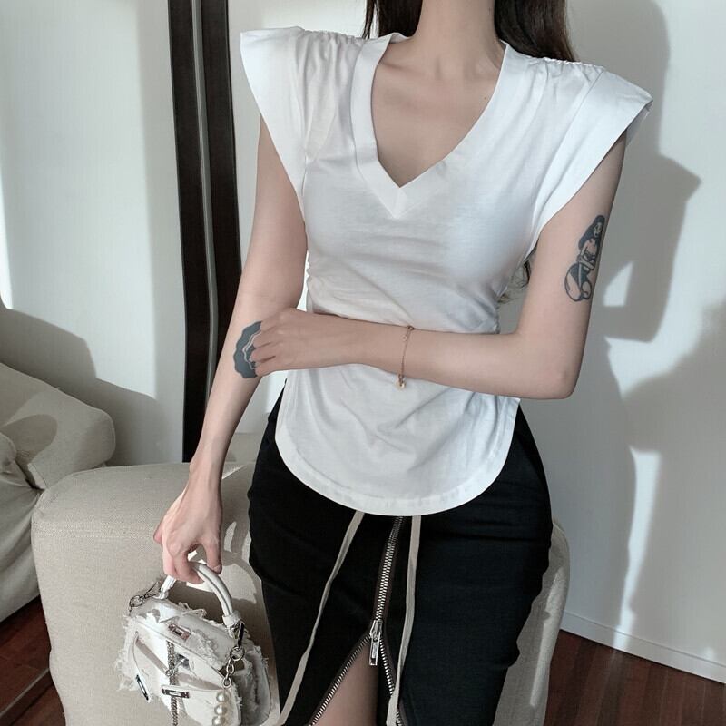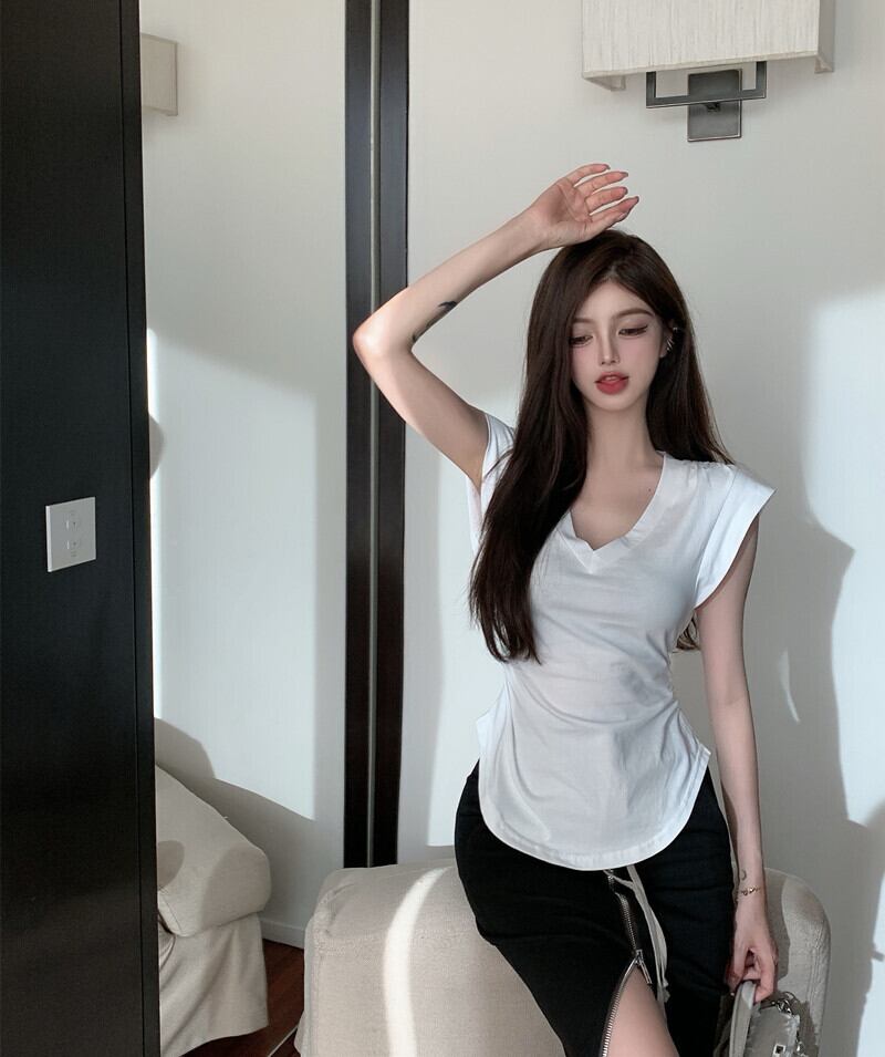 VネックホワイトTシャツ ハイウェストギャザージッパースカート レッドサマー ストリート 夏物 ガールズファッション10576106012