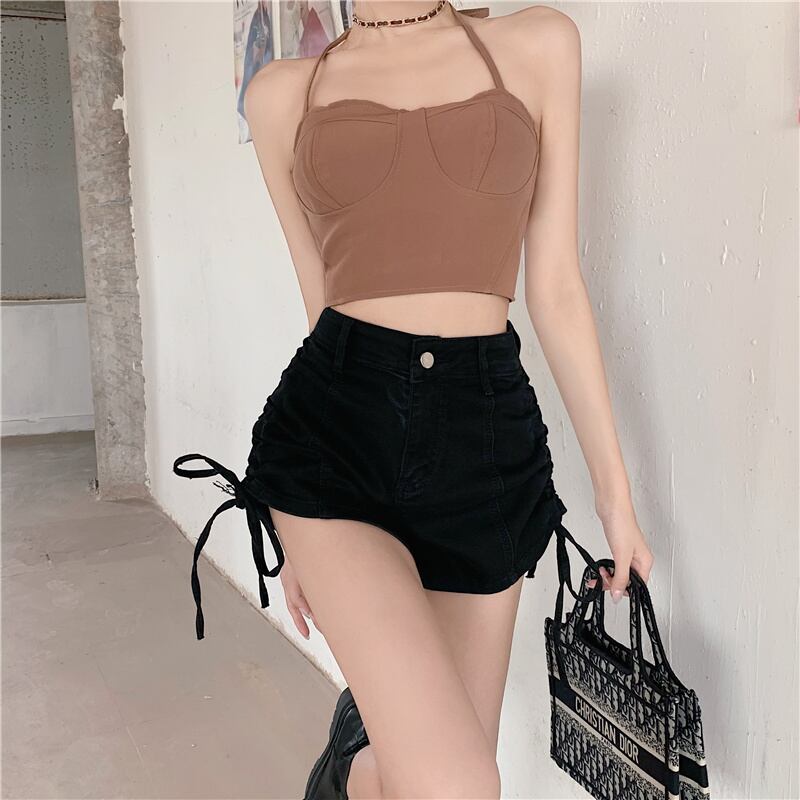 ギャザージーンズ サマーハイウェスト薄手パンツ カジュアルブラックショーツ ストリート 夏物 ブルマー ガールズファッション78522333034