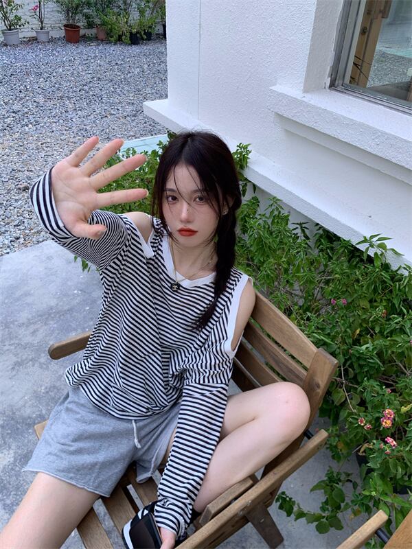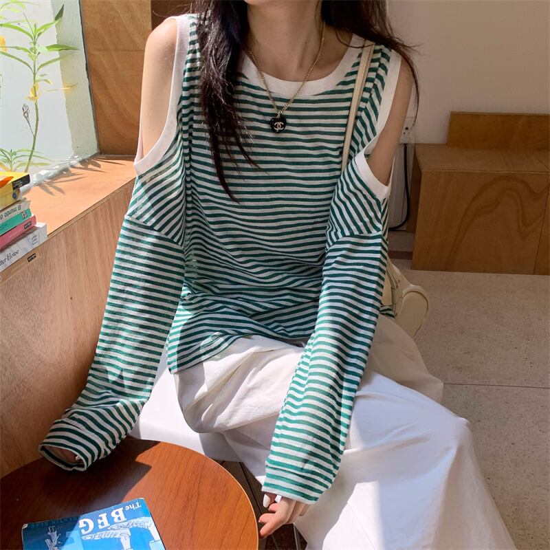 ストラップレスストライプTシャツ レディースサマールーズ薄手ブラウス トップス ロング 大人ガーリー スウィート キュート カジュアル 夏物 ガールズファッション97846838438
