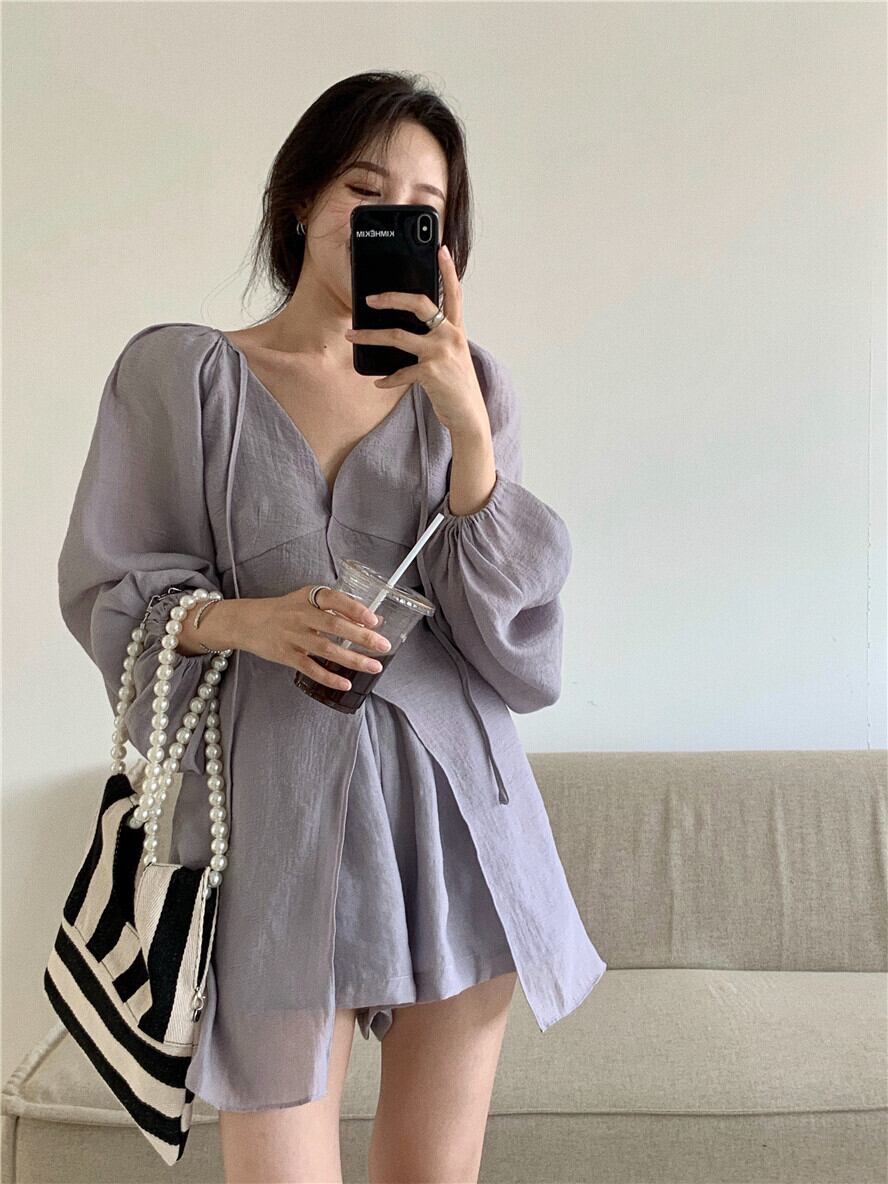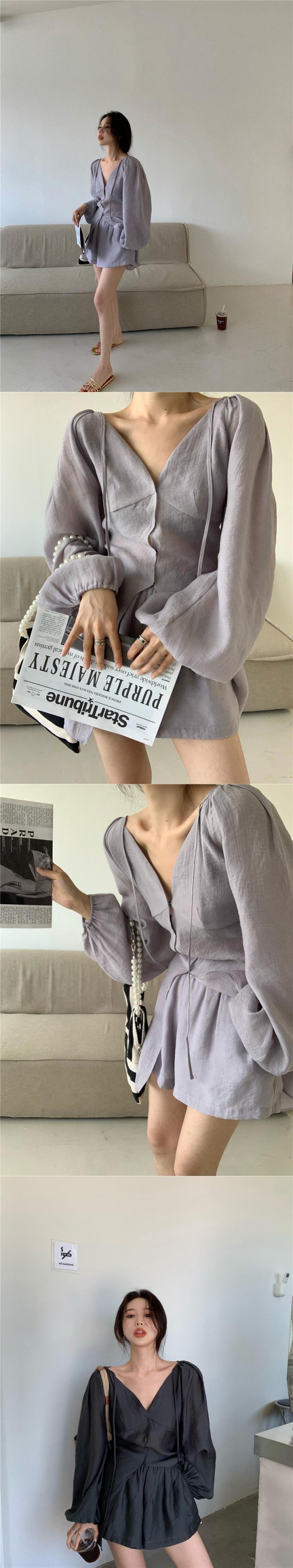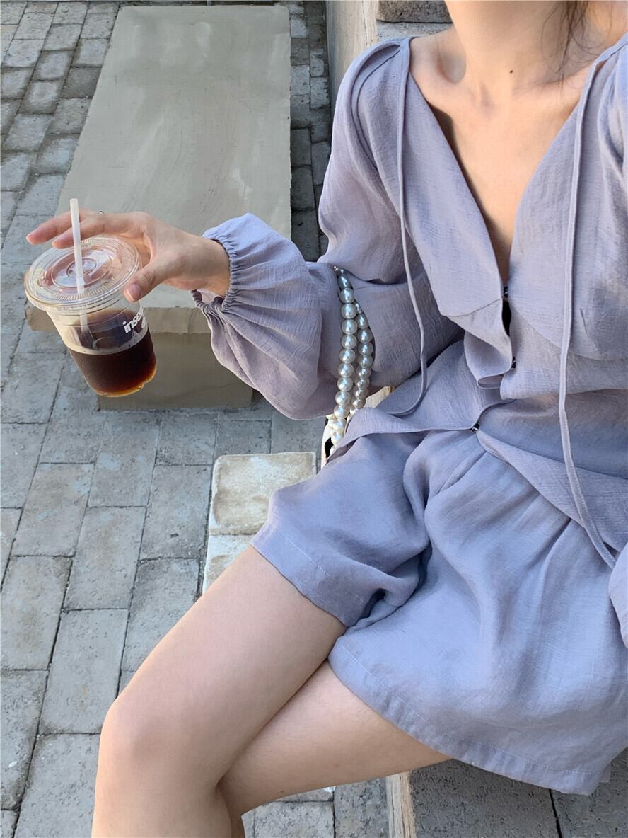 色:パープルトップ,パープルショーツ,グレートップ,グレーのショートパンツ