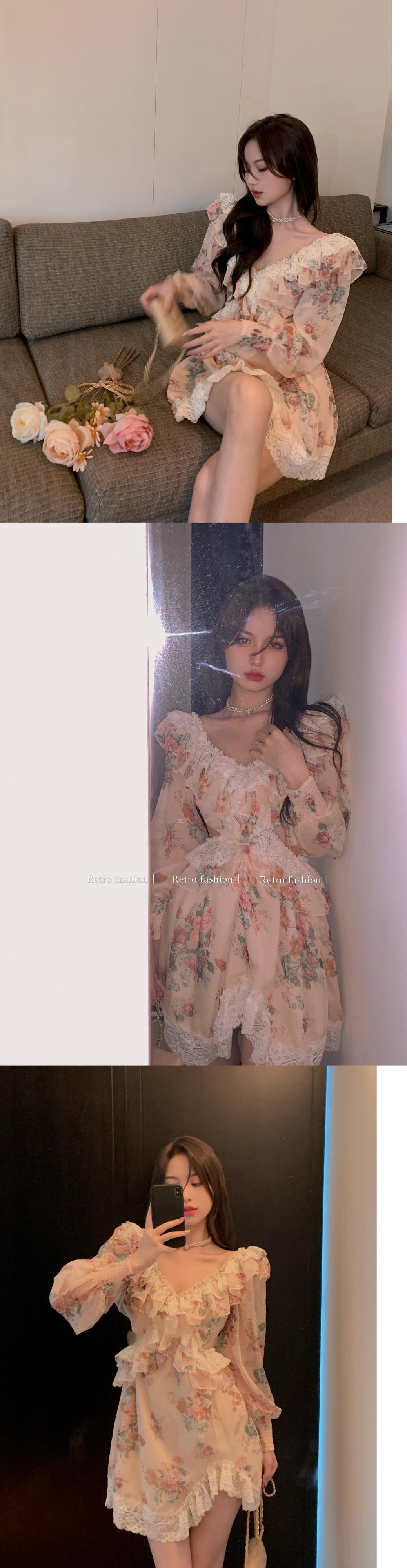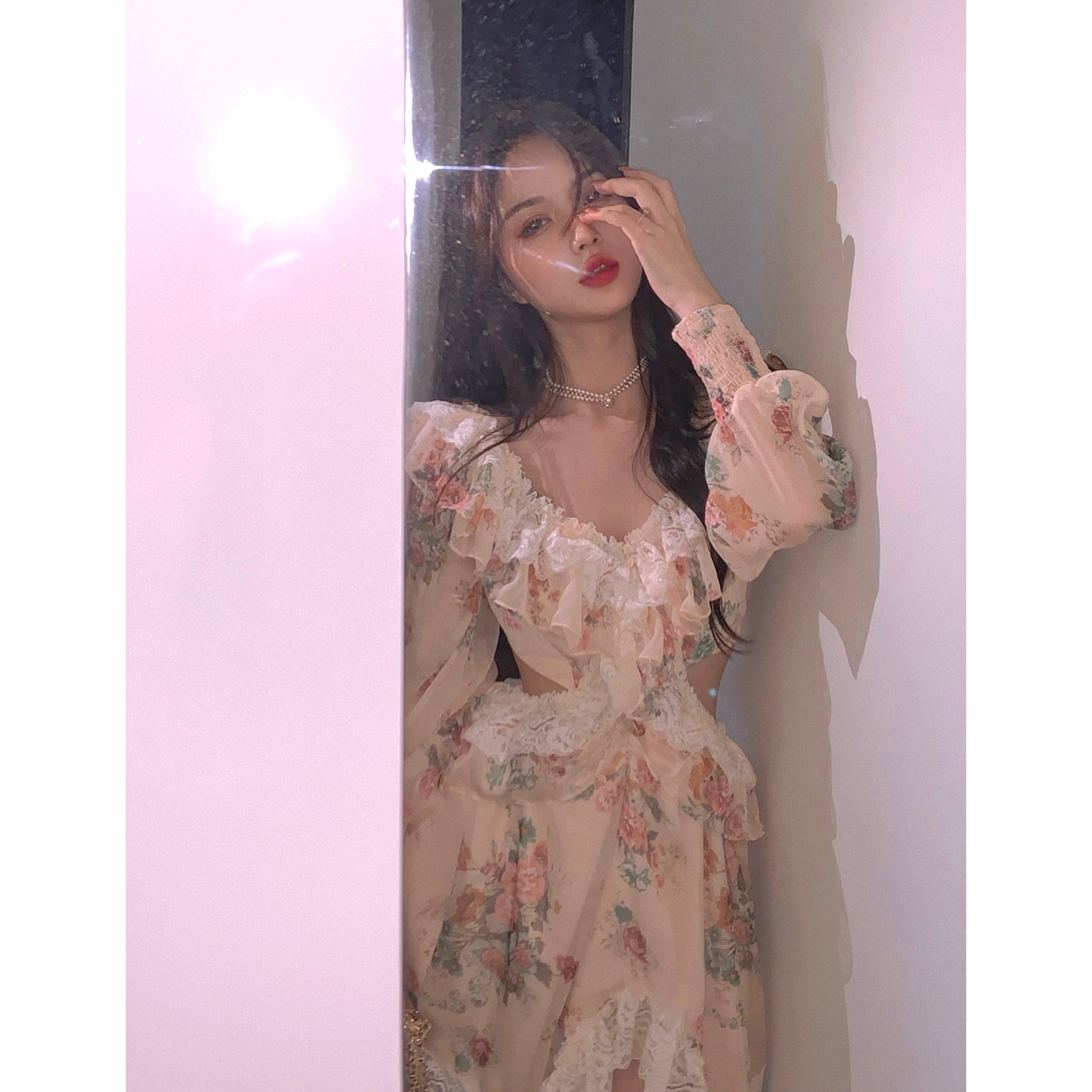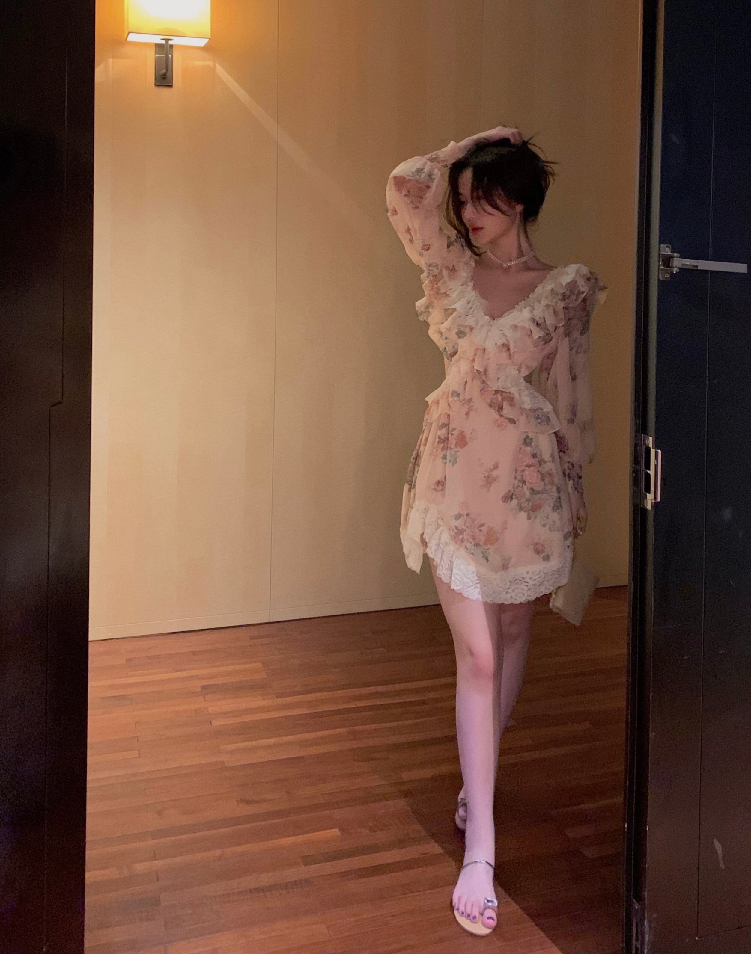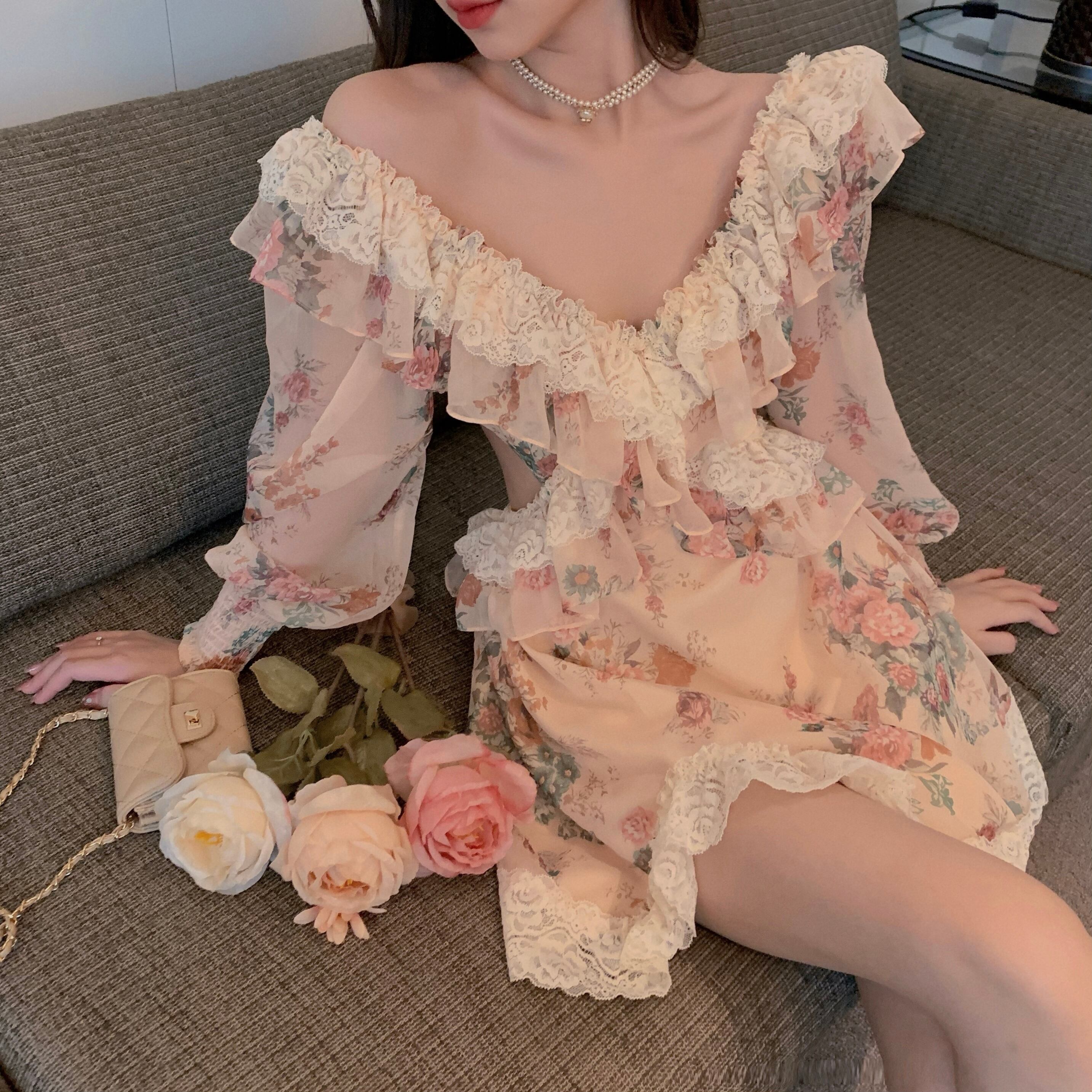 レース薄手フローラルドレス サマーVネックスカート ロング 夏物 花柄 ピュア ステッチ ガールズファッション42416636924