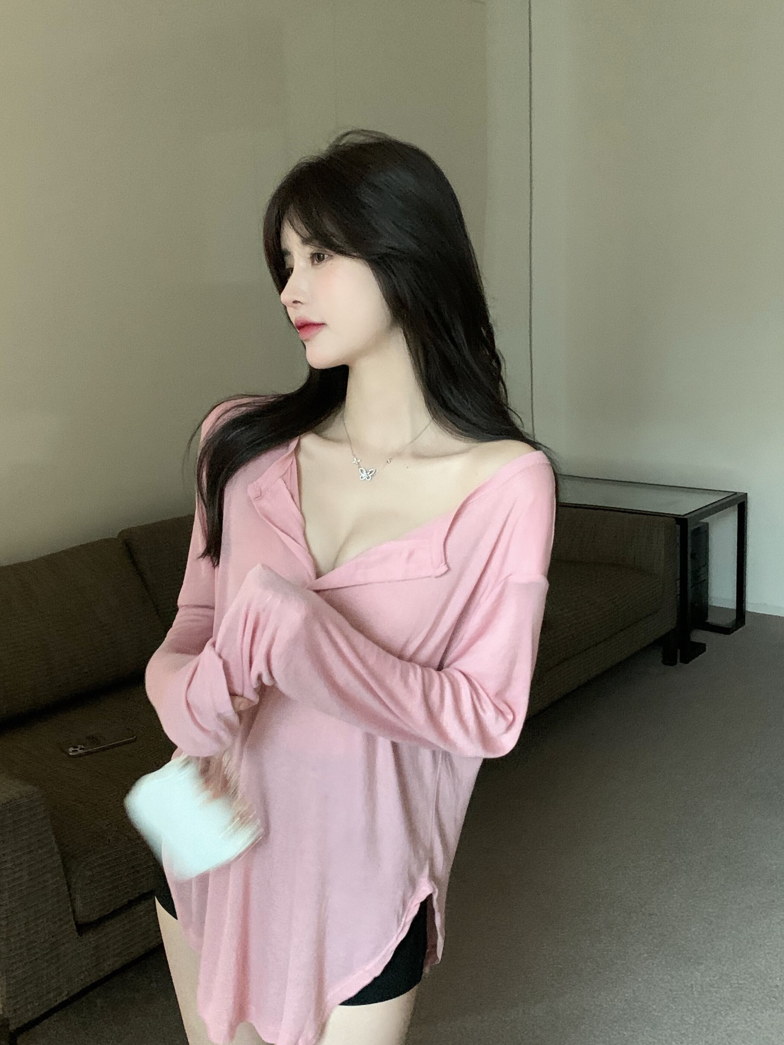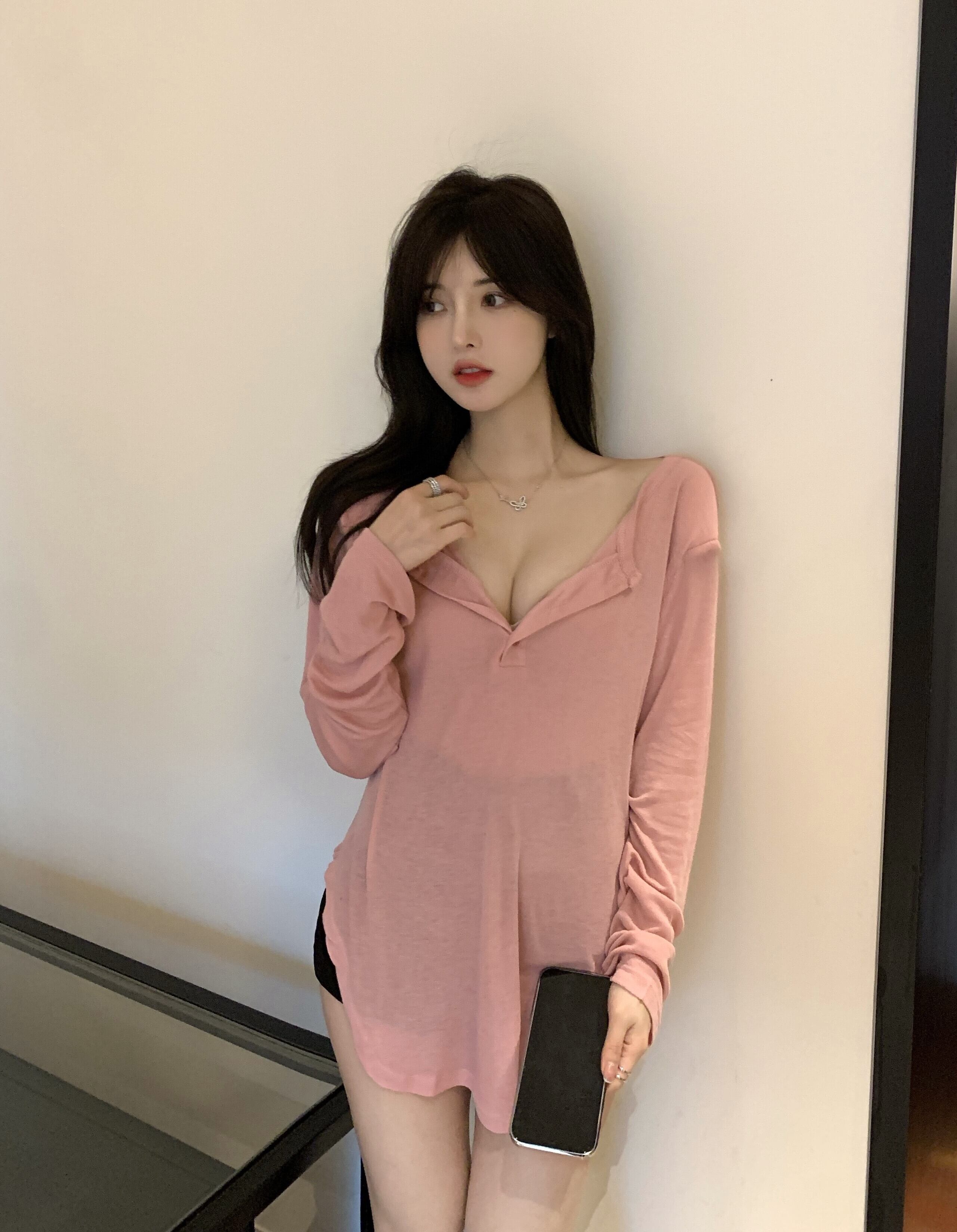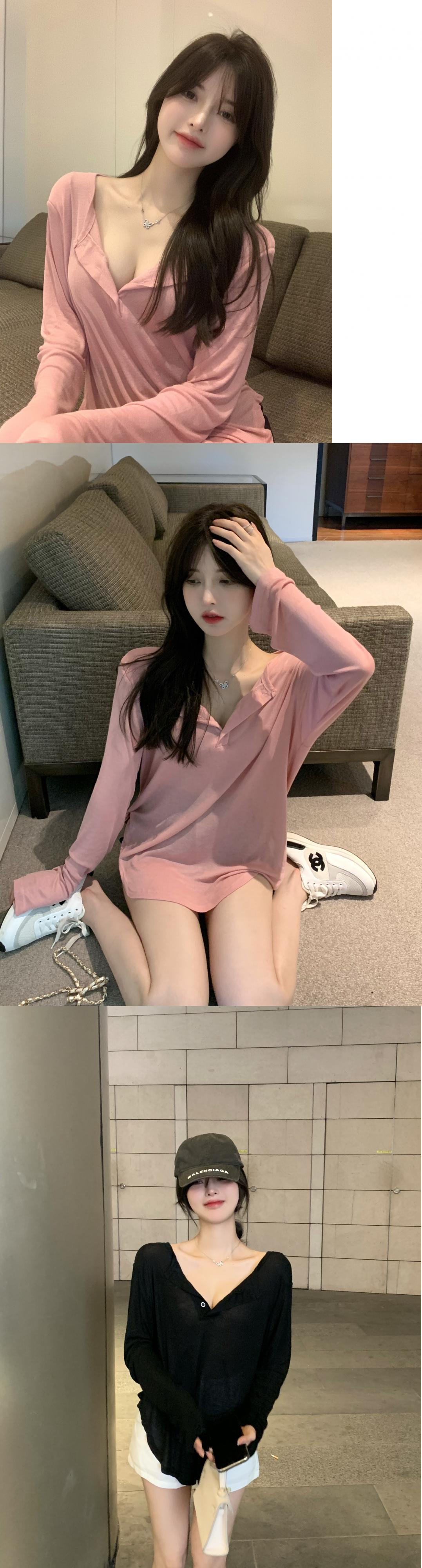 Vネックブラウス レディースサマールーズカジュアルTシャツ ロング ピンク 夏物 ピュア ガールズファッション62365731075