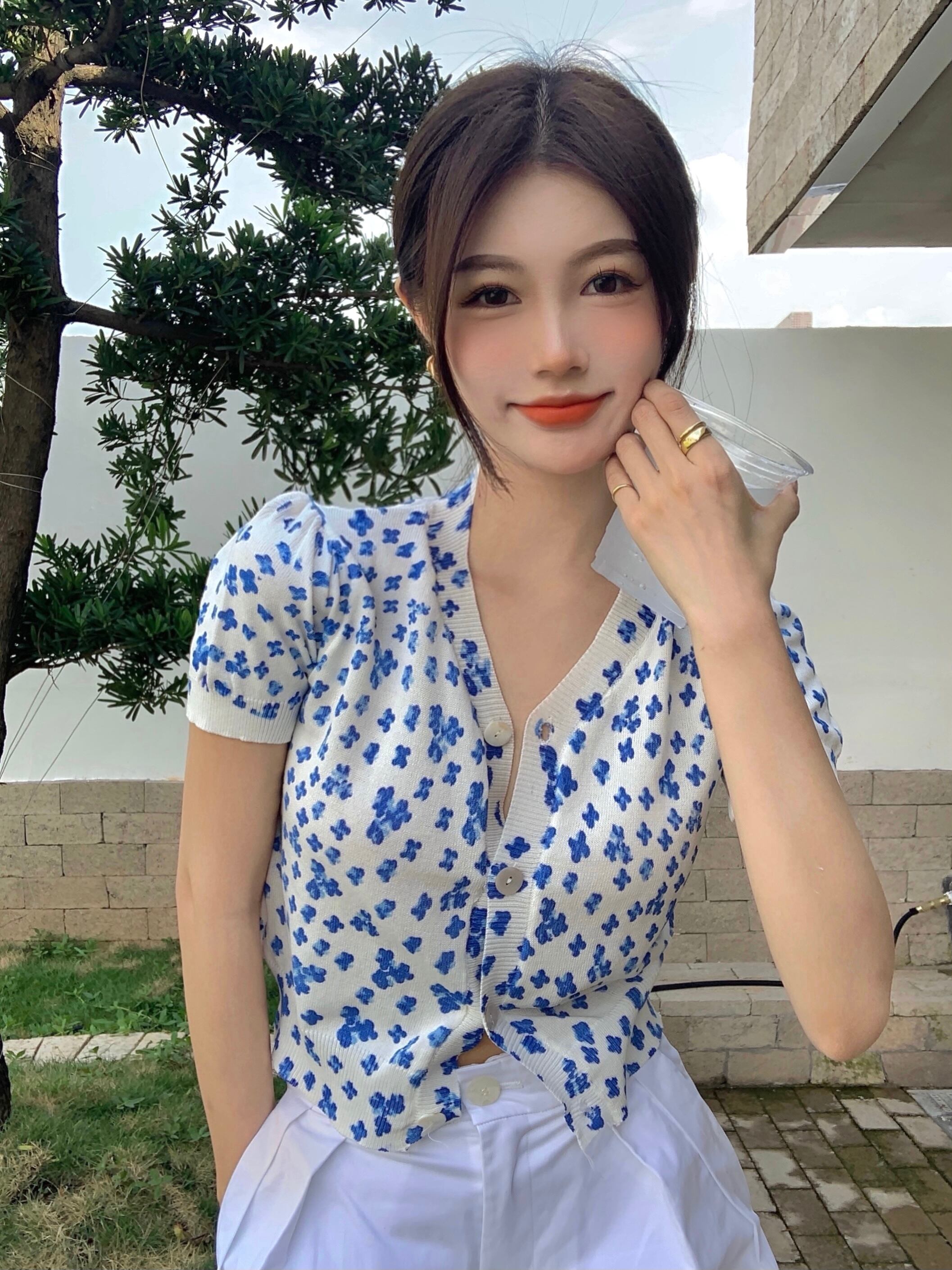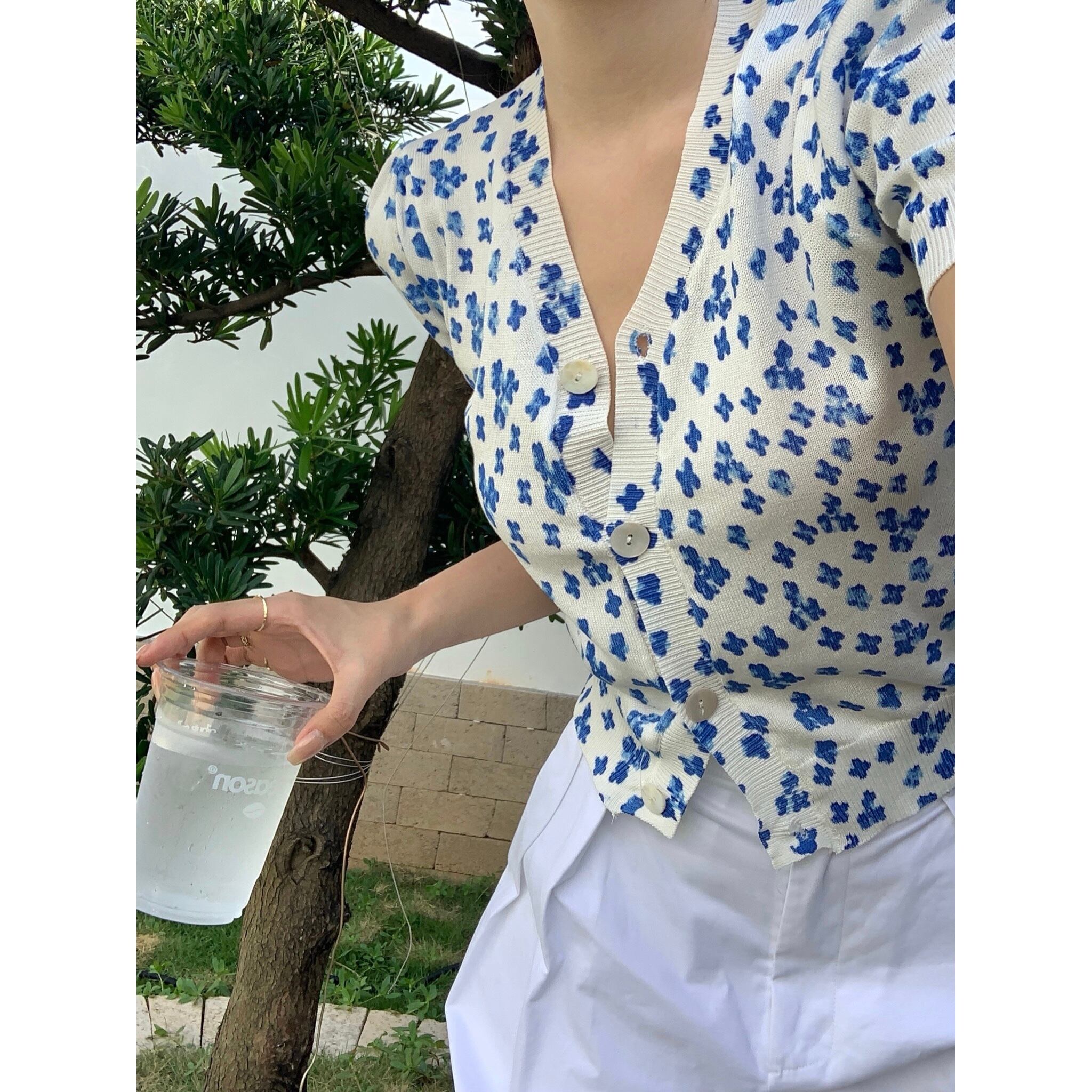 Vネックスタンダードブループリント柄薄手ニットTシャツ レディースサマーショートカジュアルトップス レトロ 大人ガーリー スウィート キュート 夏物 ガールズファッション78657260329