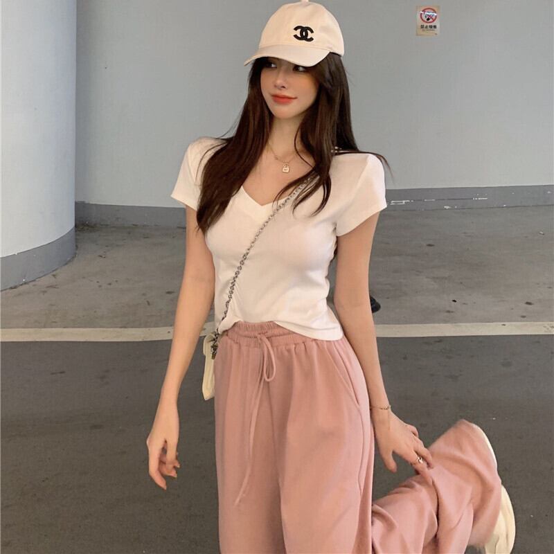 Vネックショートトップス レディースサマーカジュアル薄手Tシャツ 大人ガーリー スウィート キュート 夏物 ガールズファッション51225771473