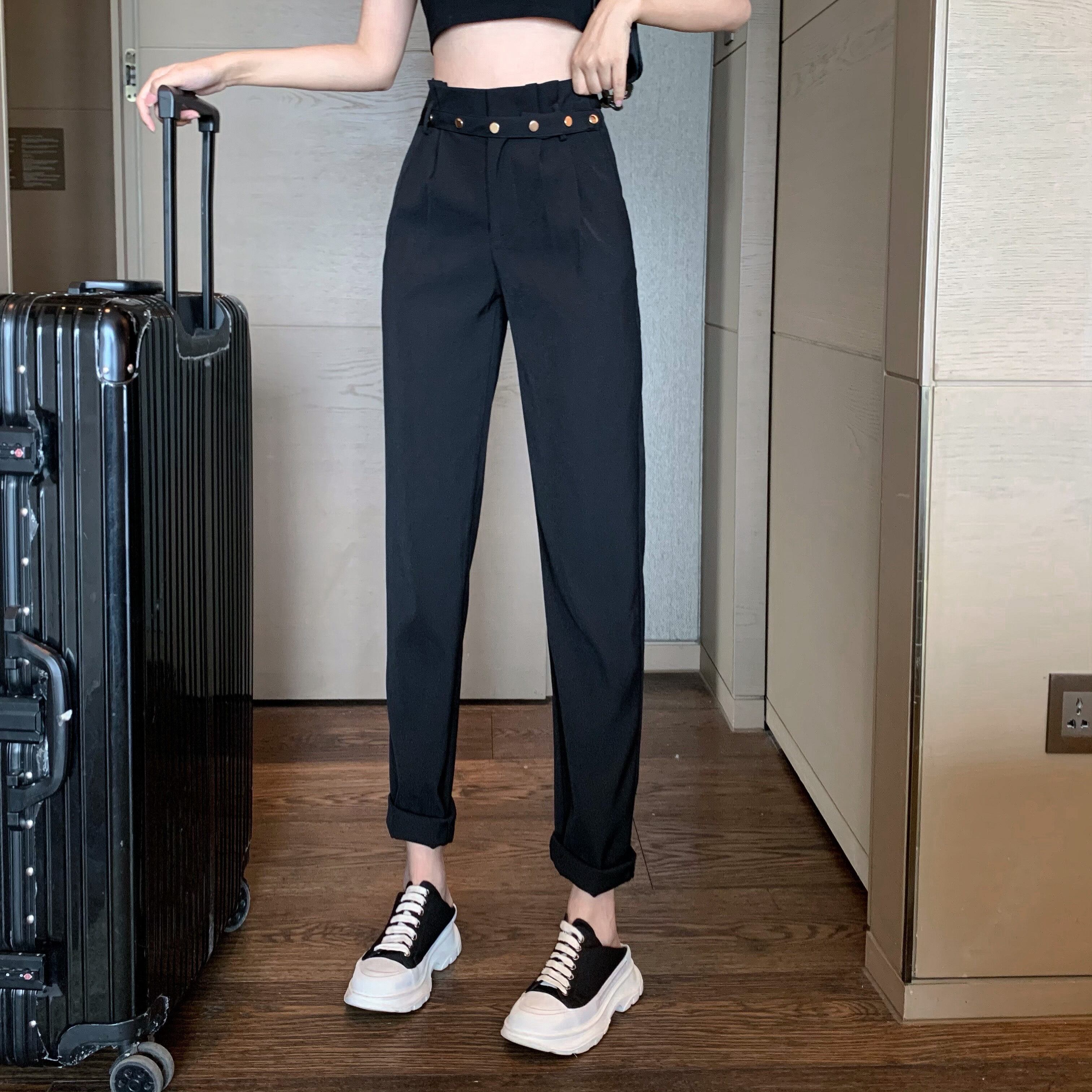 ブラックパンツ サマーハイウェストウェストスリムスタンダードルーズカジュアル レトロ 夏物 ガールズファッション66956895682