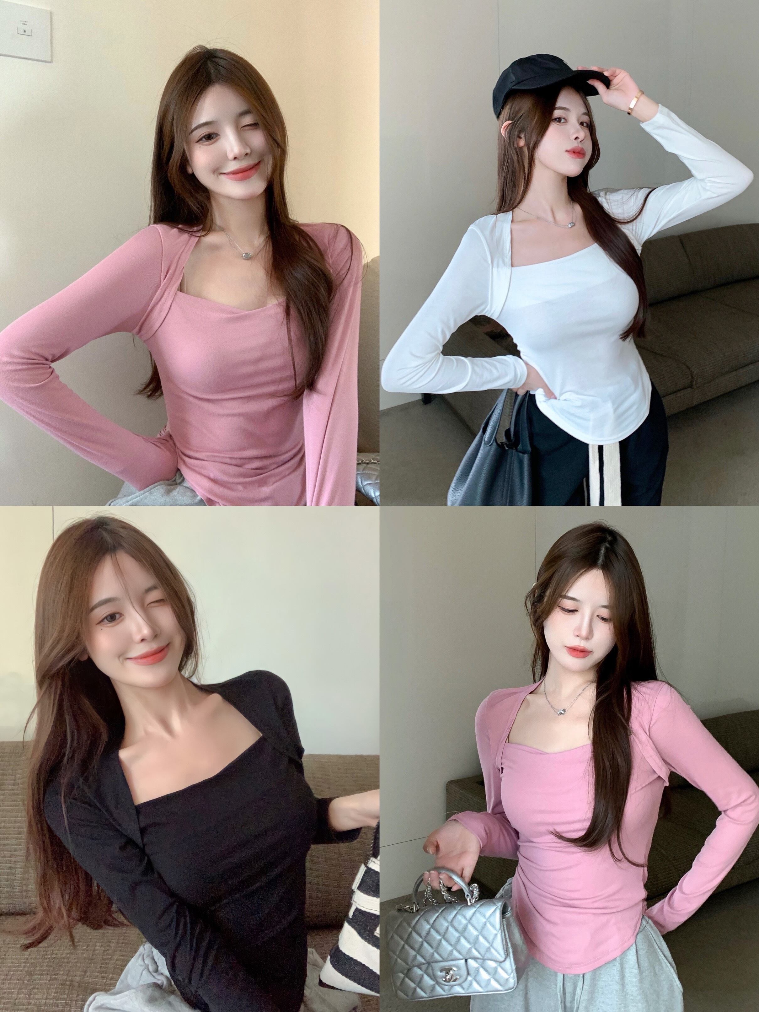 スリムブラウス オータムソリッド カラーシャツ Tシャツ ロング 秋物 ソリッドカラー スクウェア ガールズファッション7469016750