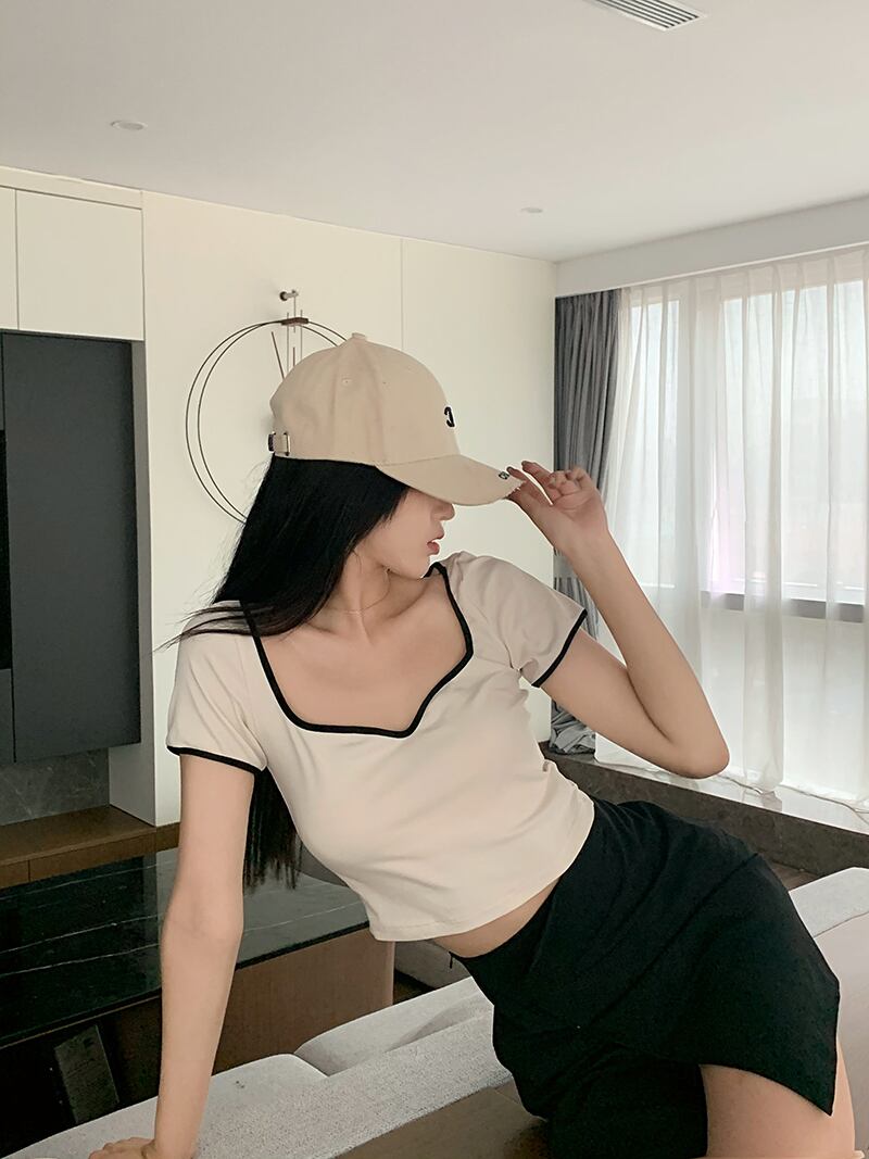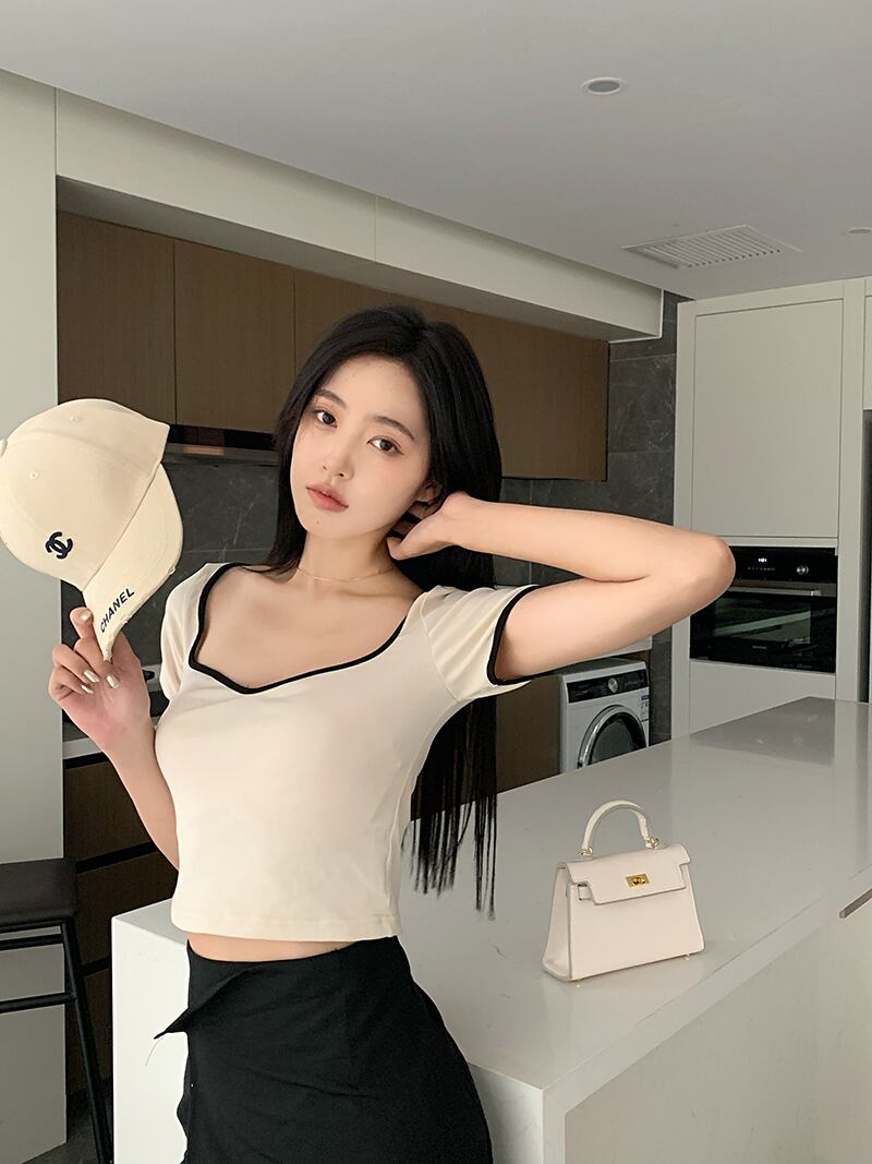 カラーブラウス サマーレッドショート薄手Tシャツ ストリート 夏物 ピュア スクウェア ガールズファッション92854966083