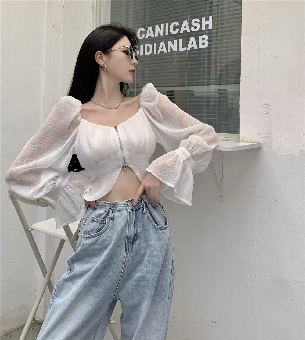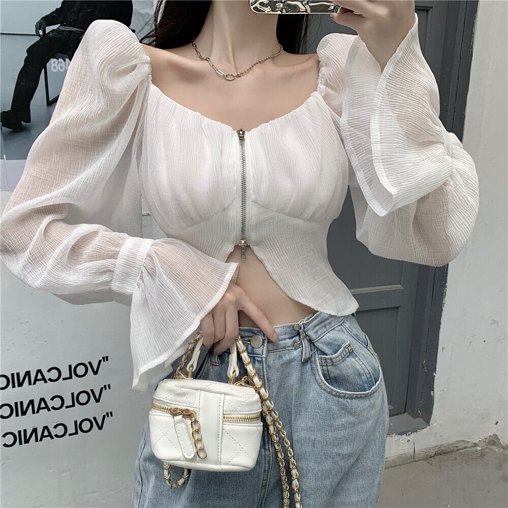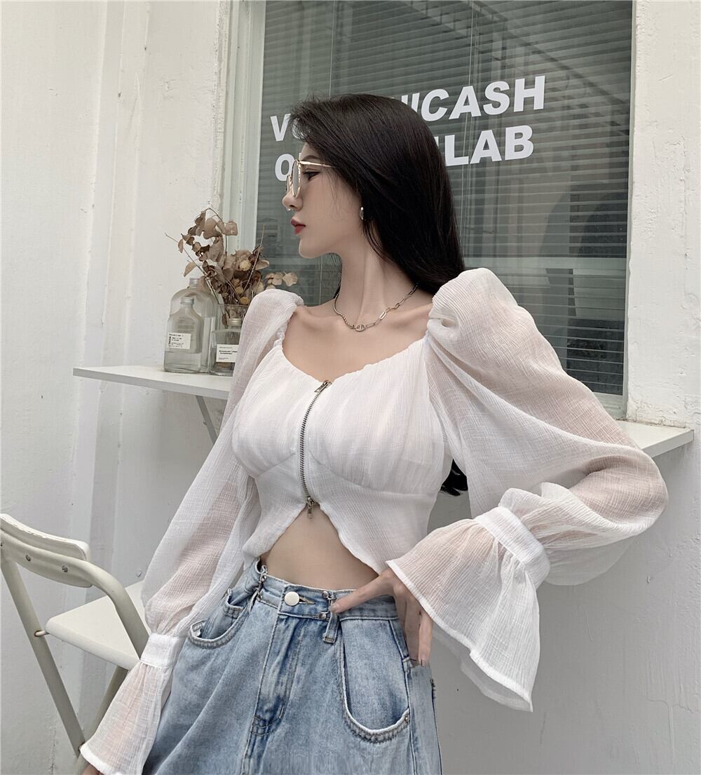 薄手ホワイトシフォンシャツ レディースサマーショートクロップトップ トップス ロング 夏物 ピュア ガールズファッション48681004867