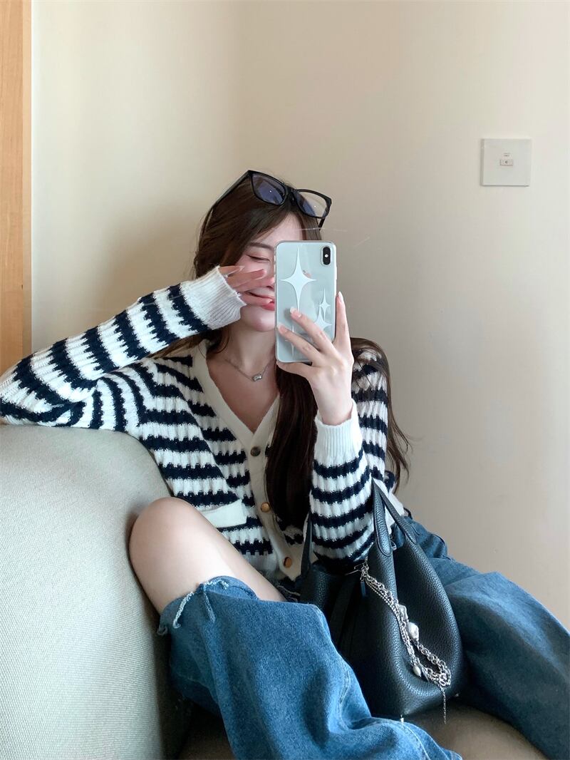 ストライプカラーニットカーディガントップス レディースサマーVネックショートセーター ロング 夏物 ガールズファッション40479698023