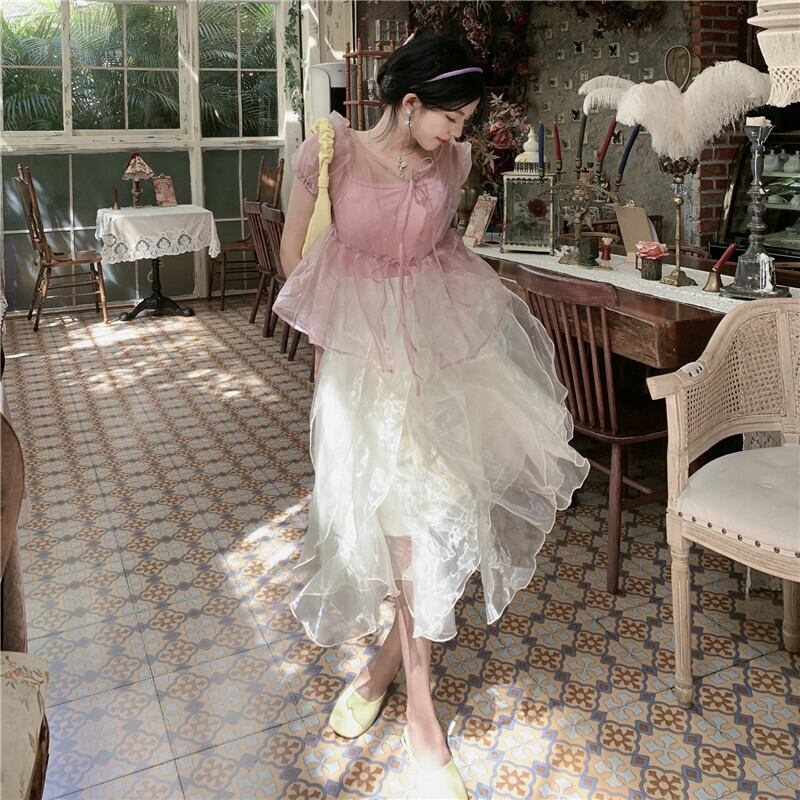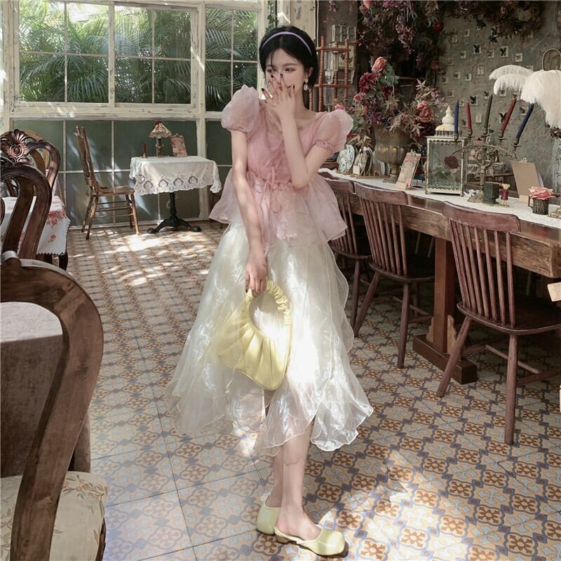 スカート ウェスト薄手スリーブトップス ピンク 大人ガーリー スウィート キュート カジュアル ガールズファッション215251536