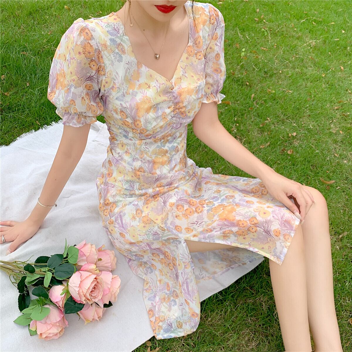 サマーVネックドレス スタンダードフローラルウェスト薄手Aラインスカート レトロ 夏物 花柄 ガールズファッション49613413202