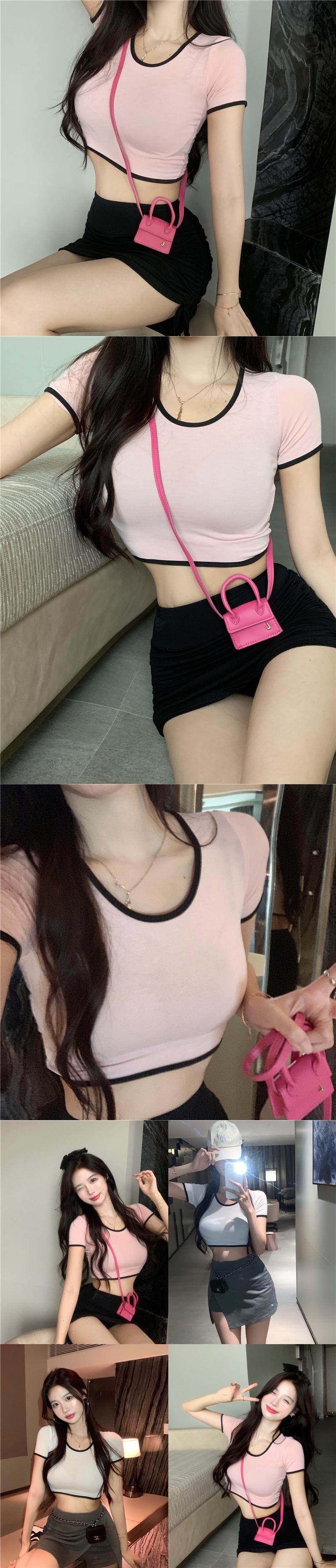カラーラウンドネックニットTシャツ シャツ サマーハイウェストクロップドクロップトップ トップス 夏物 Oネック ピュア ガールズファッション19545475326