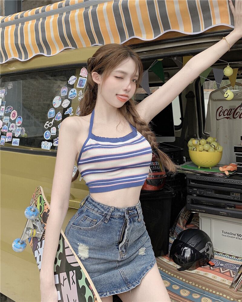 ホルターストライプショートトップス サマー ストリート 夏物 ピュア ガールズファッション98306130565