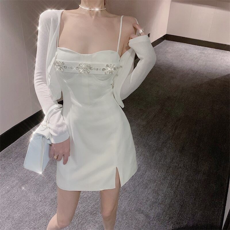 色:白い日焼け止め,黒い日焼け防止服,白いドレス,ブラックサスペンダースカート