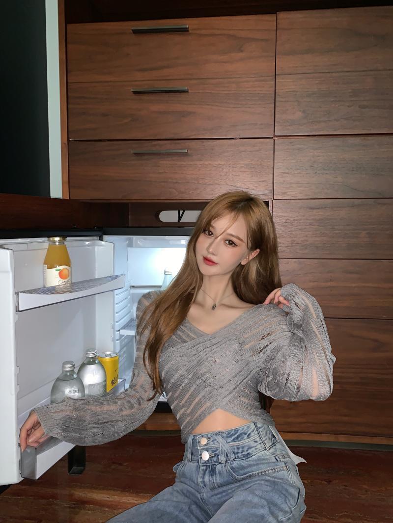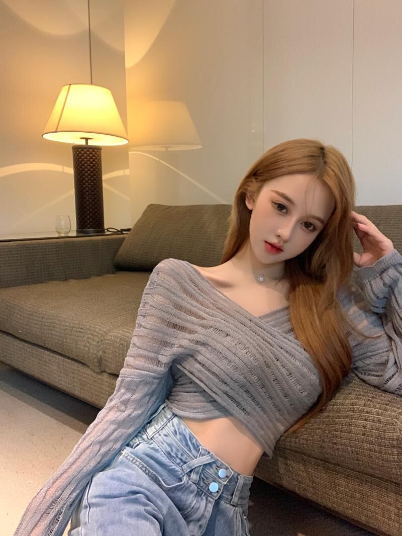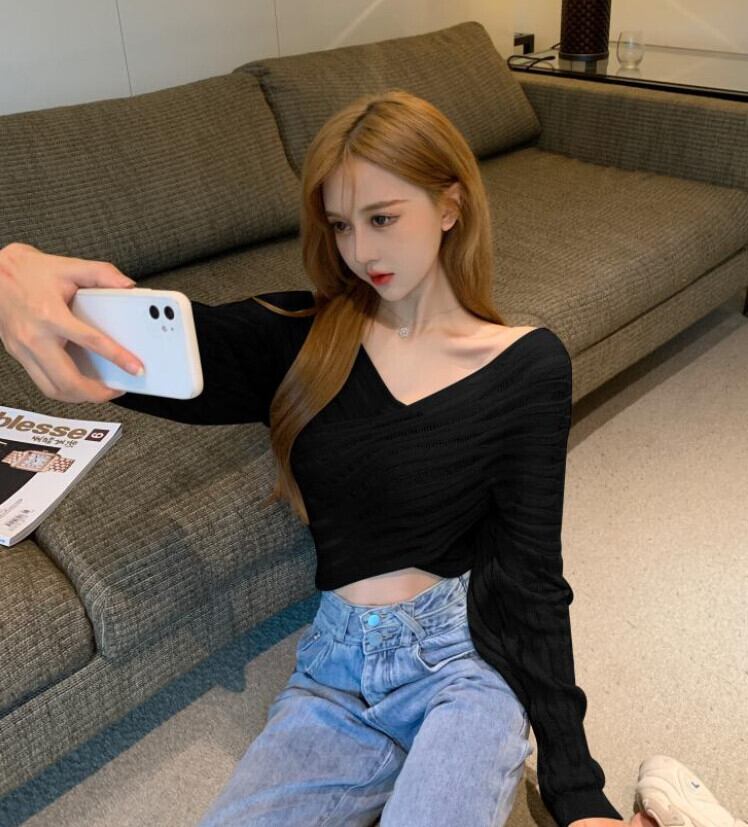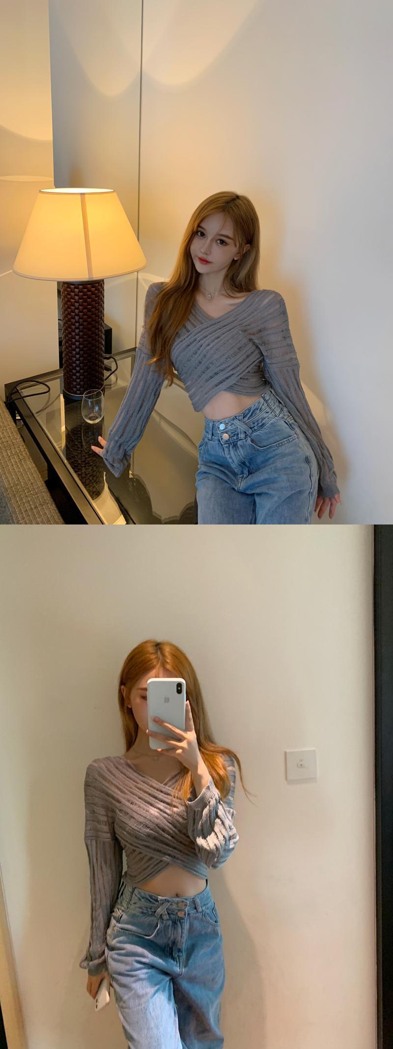 クロスVネックショートニット サマートップス 長袖スリーブブラウス ロング 夏物 ガールズファッション92581605203