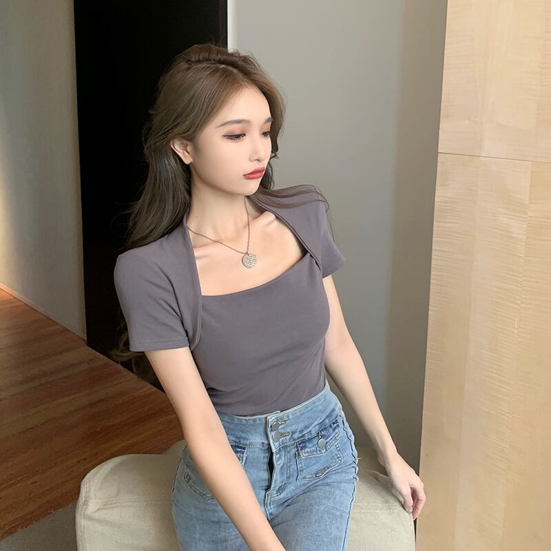 ショートトップス サマースタンダードカラーホワイトTシャツ レトロ 夏物 スクウェア ガールズファッション17572483841