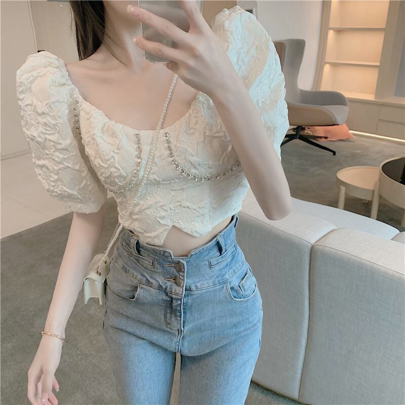 スタンダードジャカードスリーブシャツ サマーカラーストラップレスクロップトップ トップス レトロ 夏物 ガールズファッション66439000412