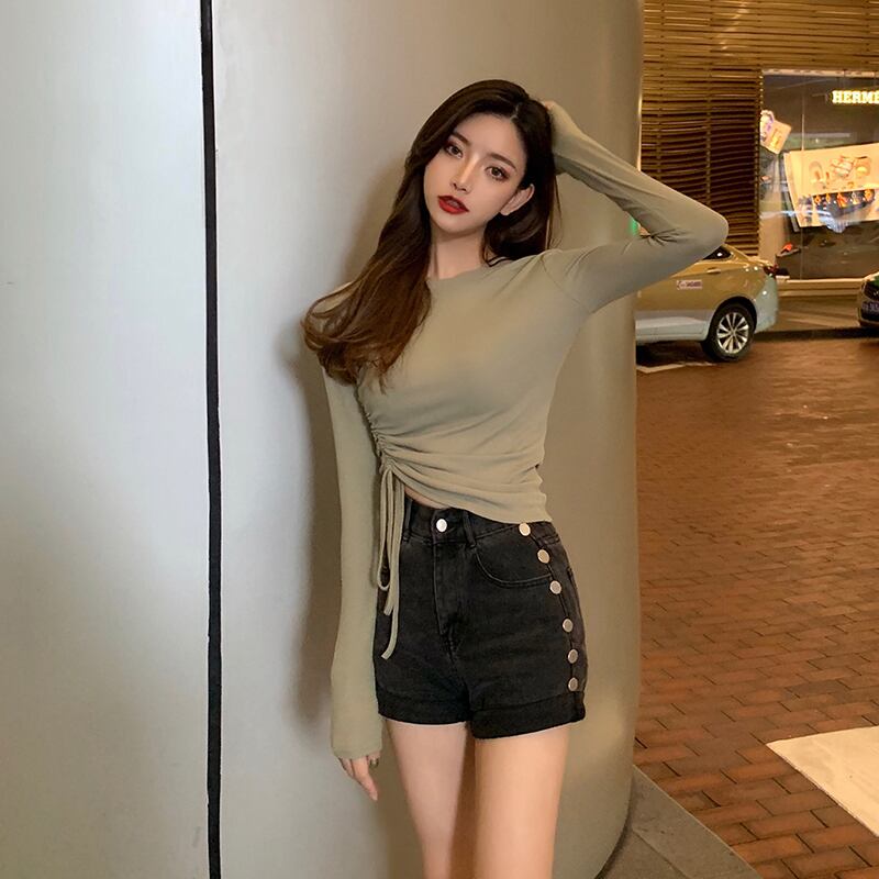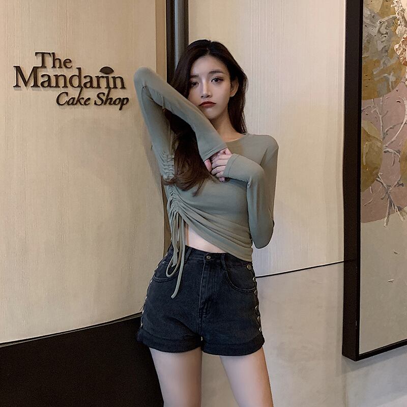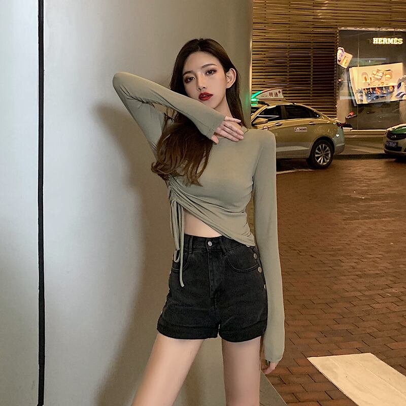 プリーツスリムブラウス オータムラウンドネックTシャツ ロング 秋物 Oネック ピュア ガールズファッション10946978649