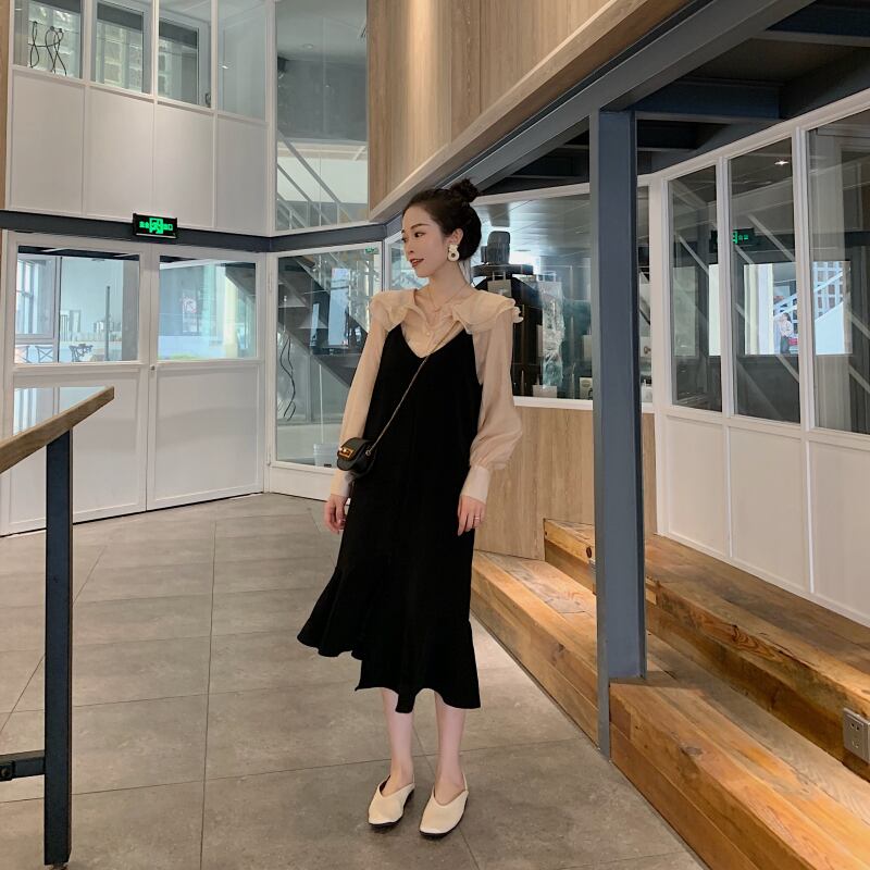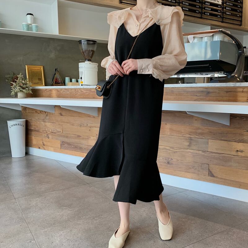 シフォンシャツ オータムスタンダードブラックドレス ロング レトロ 秋物 ピュア ガールズファッション75898087526